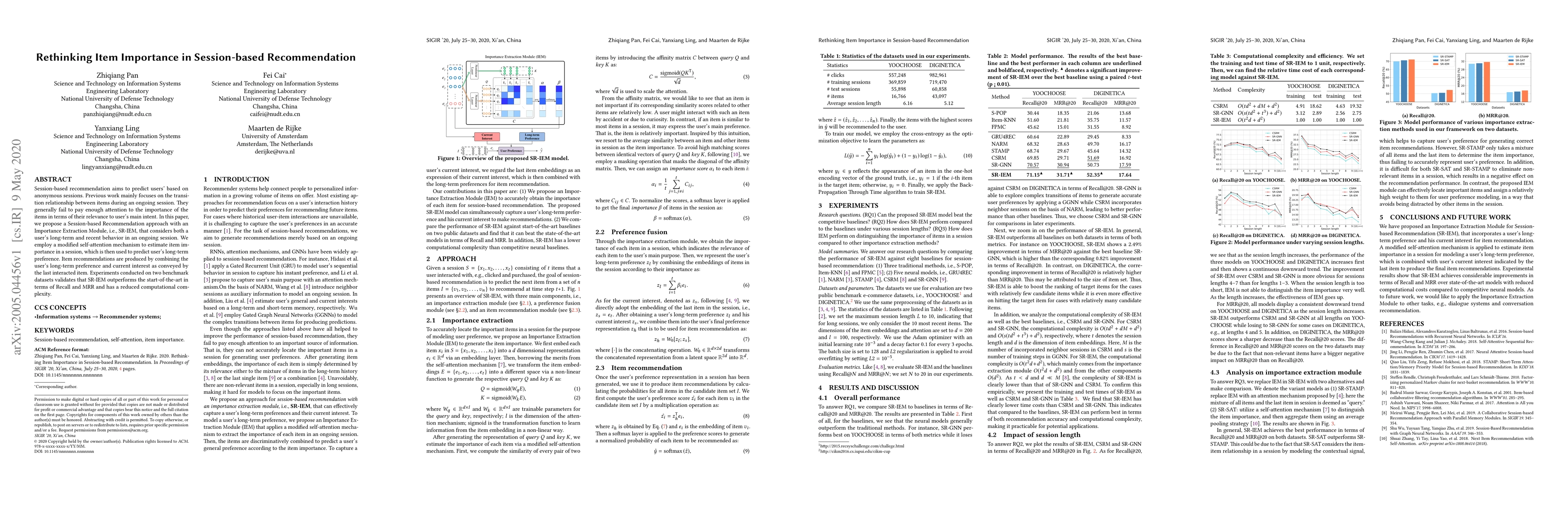 This paper proposes SR-IEM, a Session-based Recommendation approach that incorporates an Importance Extraction Module to assess item relevance to user intent. It uses a modified self-attention mechanism to estimate item importance, improving long-term preference prediction and recommendation accuracy, outperforming existing methods.