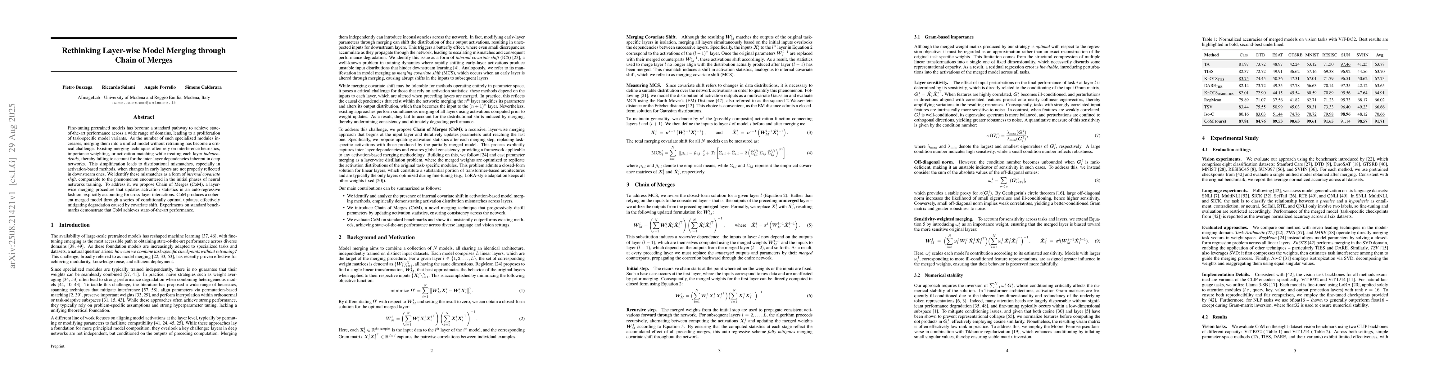 Fine-tuning pretrained models has become a standard pathway to achieve state-of-the-art performance across a wide range of domains, leading to a proliferation of task-specific model variants. As the number of such specialized modules in-creases, merging them into a unified model without retraining has become a critical challenge. Existing merging techniques often rely on interference heuristics,importance weighting, or activation matching while treating each layer independently, thereby failing to account for the inter-layer dependencies inherent in deep networks. This simplification leads to distributional mismatches, especially inactivation-based methods, when changes in early layers are not properly reflected in downstream ones. We identify these mismatches as a form of internal covariate shift, comparable to the phenomenon encountered in the initial phases of neural networks training. To address it, we propose Chain of Merges (CoM), a layer-wise merging procedure that updates activation statistics in an auto-regressive fashion, explicitly accounting for cross-layer interactions. CoM produces a coherent merged model through a series of conditionally optimal updates, effectively mitigating degradation caused by covariate shift. Experiments on standard bench-marks demonstrate that CoM achieves state-of-the-art performance.