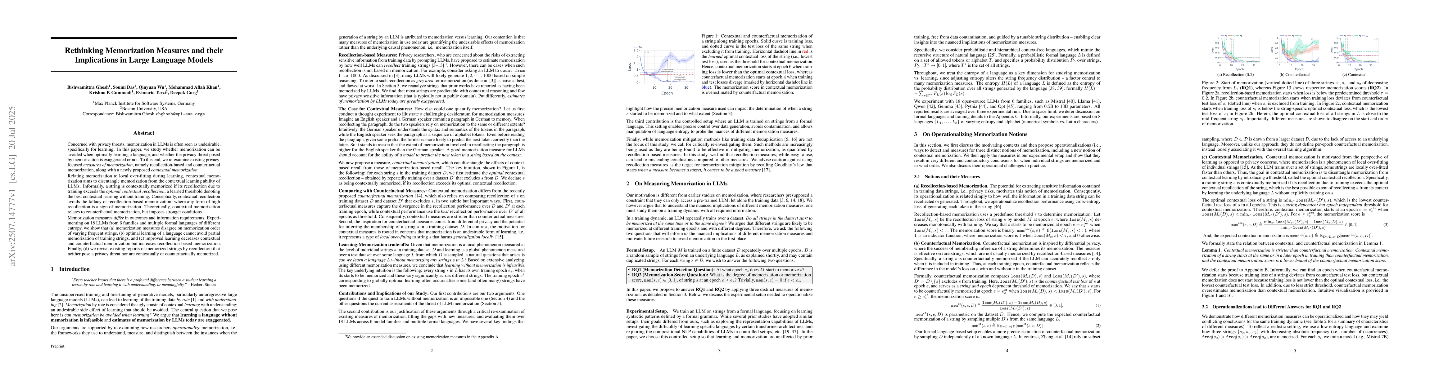 Concerned with privacy threats, memorization in LLMs is often seen as undesirable, specifically for learning. In this paper, we study whether memorization can be avoided when optimally learning a language, and whether the privacy threat posed by memorization is exaggerated or not. To this end, we re-examine existing privacy-focused measures of memorization, namely recollection-based and counterfactual memorization, along with a newly proposed contextual memorization. Relating memorization to local over-fitting during learning, contextual memorization aims to disentangle memorization from the contextual learning ability of LLMs. Informally, a string is contextually memorized if its recollection due to training exceeds the optimal contextual recollection, a learned threshold denoting the best contextual learning without training. Conceptually, contextual recollection avoids the fallacy of recollection-based memorization, where any form of high recollection is a sign of memorization. Theoretically, contextual memorization relates to counterfactual memorization, but imposes stronger conditions. Memorization measures differ in outcomes and information requirements. Experimenting on 18 LLMs from 6 families and multiple formal languages of different entropy, we show that (a) memorization measures disagree on memorization order of varying frequent strings, (b) optimal learning of a language cannot avoid partial memorization of training strings, and (c) improved learning decreases contextual and counterfactual memorization but increases recollection-based memorization. Finally, (d) we revisit existing reports of memorized strings by recollection that neither pose a privacy threat nor are contextually or counterfactually memorized.