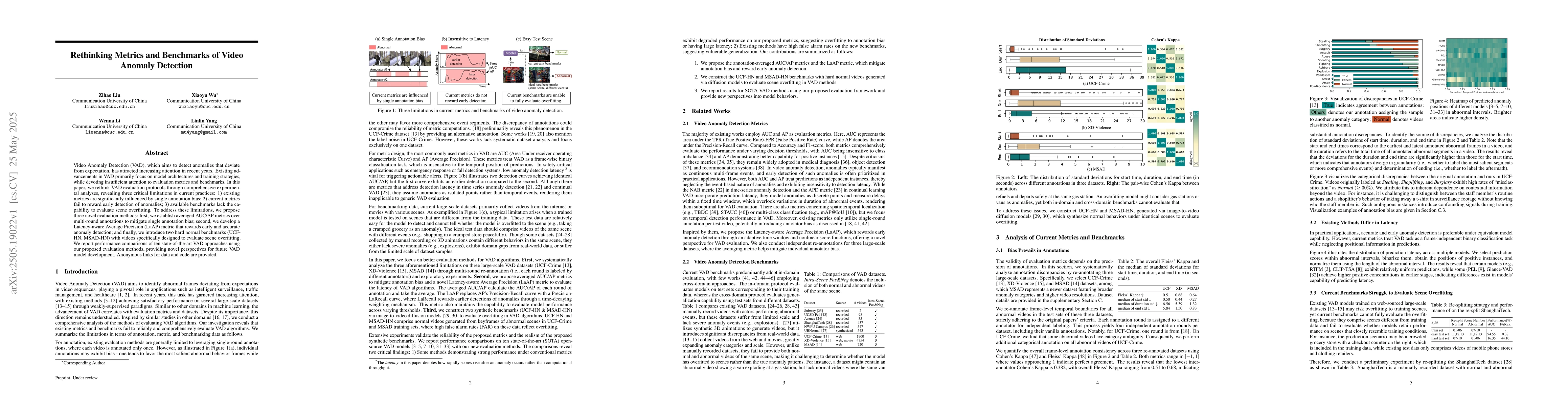 The paper proposes averaged AUC/AP metrics, LaAP, and two hard normal benchmarks (UCF-HN, MSAD-HN) for improved VAD evaluation.