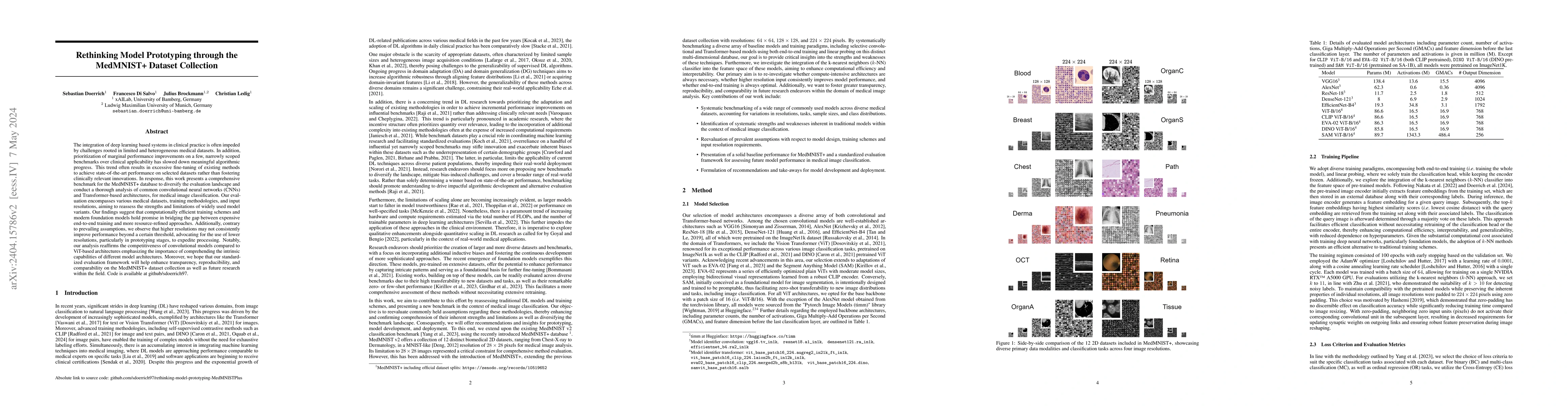 The integration of deep learning based systems in clinical practice is often impeded by challenges rooted in limited and heterogeneous medical datasets. In addition, prioritization of marginal performance improvements on a few, narrowly scoped benchmarks over clinical applicability has slowed down meaningful algorithmic progress. This trend often results in excessive fine-tuning of existing methods to achieve state-of-the-art performance on selected datasets rather than fostering clinically relevant innovations. In response, this work presents a comprehensive benchmark for the MedMNIST+ database to diversify the evaluation landscape and conduct a thorough analysis of common convolutional neural networks (CNNs) and Transformer-based architectures, for medical image classification. Our evaluation encompasses various medical datasets, training methodologies, and input resolutions, aiming to reassess the strengths and limitations of widely used model variants. Our findings suggest that computationally efficient training schemes and modern foundation models hold promise in bridging the gap between expensive end-to-end training and more resource-refined approaches. Additionally, contrary to prevailing assumptions, we observe that higher resolutions may not consistently improve performance beyond a certain threshold, advocating for the use of lower resolutions, particularly in prototyping stages, to expedite processing. Notably, our analysis reaffirms the competitiveness of convolutional models compared to ViT-based architectures emphasizing the importance of comprehending the intrinsic capabilities of different model architectures. Moreover, we hope that our standardized evaluation framework will help enhance transparency, reproducibility, and comparability on the MedMNIST+ dataset collection as well as future research within the field. Code is available at https://github.com/sdoerrich97 .