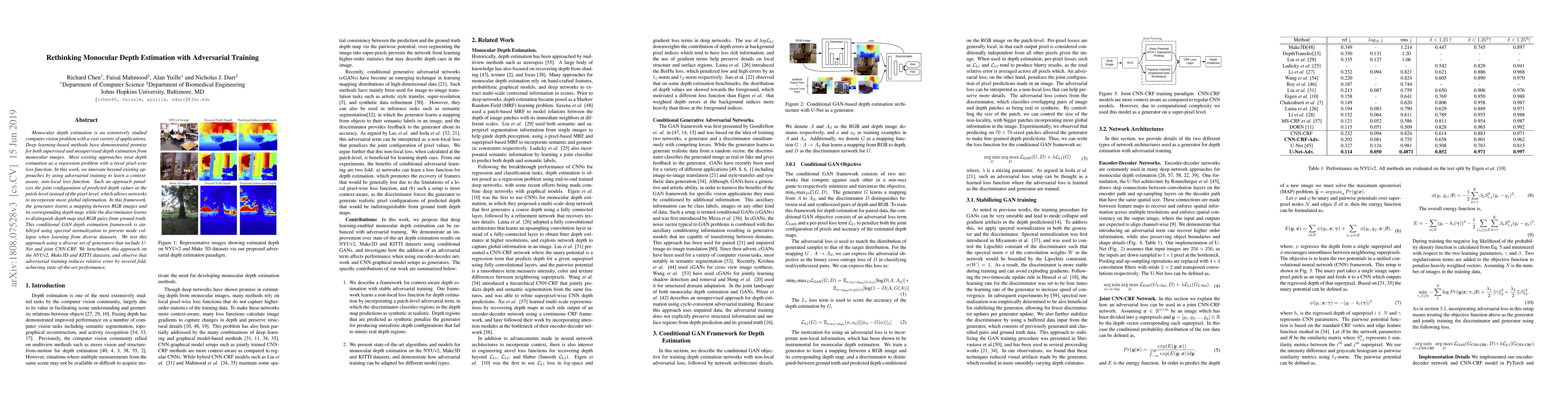 Monocular depth estimation is an extensively studied computer vision problem with a vast variety of applications. Deep learning-based methods have demonstrated promise for both supervised and unsupervised depth estimation from monocular images. Most existing approaches treat depth estimation as a regression problem with a local pixel-wise loss function. In this work, we innovate beyond existing approaches by using adversarial training to learn a context-aware, non-local loss function. Such an approach penalizes the joint configuration of predicted depth values at the patch-level instead of the pixel-level, which allows networks to incorporate more global information. In this framework, the generator learns a mapping between RGB images and its corresponding depth map, while the discriminator learns to distinguish depth map and RGB pairs from ground truth. This conditional GAN depth estimation framework is stabilized using spectral normalization to prevent mode collapse when learning from diverse datasets. We test this approach using a diverse set of generators that include U-Net and joint CNN-CRF. We benchmark this approach on the NYUv2, Make3D and KITTI datasets, and observe that adversarial training reduces relative error by several fold, achieving state-of-the-art performance.