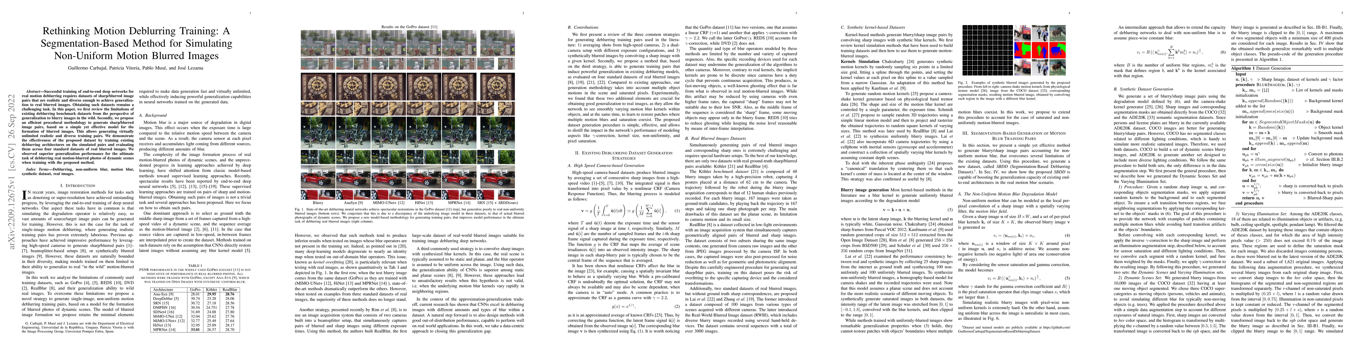 This paper critiques existing motion deblurring datasets for their lack of generalization and proposes a segmentation-based method to simulate non-uniform motion blurred images, generating virtually unlimited realistic training pairs. The method shows superior performance in deblurring real blurred images compared to training on conventional datasets.
