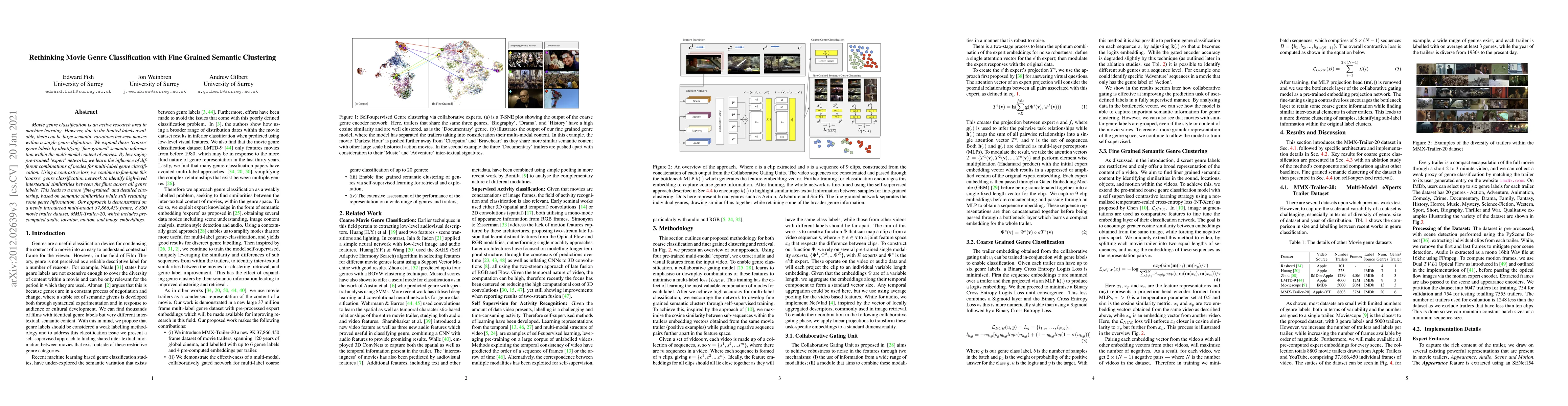 Movie genre classification is an active research area in machine learning. However, due to the limited labels available, there can be large semantic variations between movies within a single genre definition. We expand these 'coarse' genre labels by identifying 'fine-grained' semantic information within the multi-modal content of movies. By leveraging pre-trained 'expert' networks, we learn the influence of different combinations of modes for multi-label genre classification. Using a contrastive loss, we continue to fine-tune this 'coarse' genre classification network to identify high-level intertextual similarities between the movies across all genre labels. This leads to a more 'fine-grained' and detailed clustering, based on semantic similarities while still retaining some genre information. Our approach is demonstrated on a newly introduced multi-modal 37,866,450 frame, 8,800 movie trailer dataset, MMX-Trailer-20, which includes pre-computed audio, location, motion, and image embeddings.
