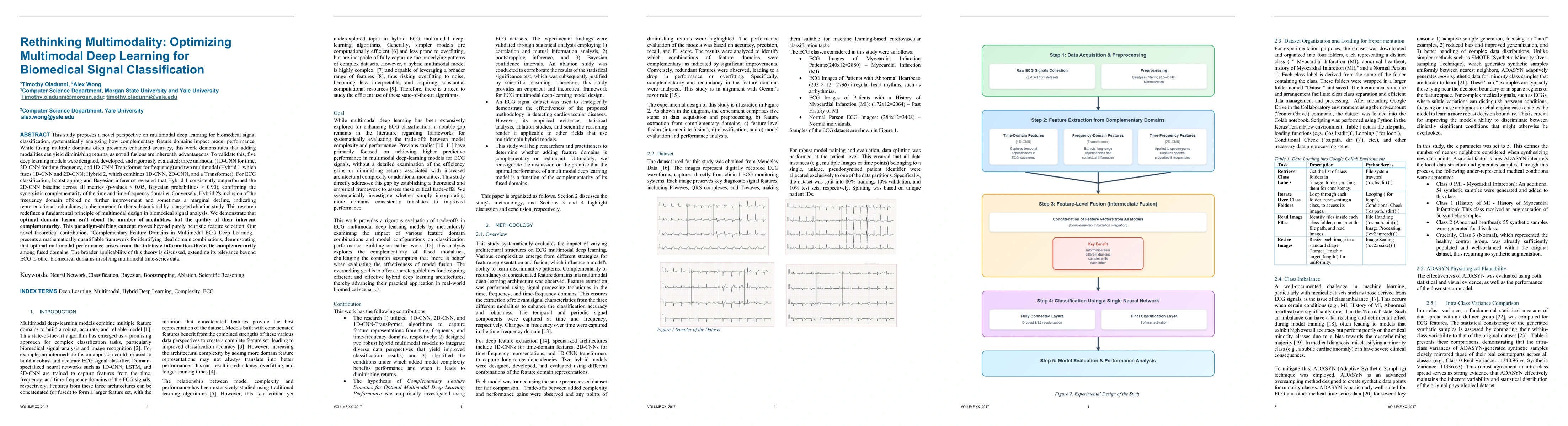 This study proposes a novel perspective on multimodal deep learning for biomedical signal classification, systematically analyzing how complementary feature domains impact model performance. While fusing multiple domains often presumes enhanced accuracy, this work demonstrates that adding modalities can yield diminishing returns, as not all fusions are inherently advantageous. To validate this, five deep learning models were designed, developed, and rigorously evaluated: three unimodal (1D-CNN for time, 2D-CNN for time-frequency, and 1D-CNN-Transformer for frequency) and two multimodal (Hybrid 1, which fuses 1D-CNN and 2D-CNN; Hybrid 2, which combines 1D-CNN, 2D-CNN, and a Transformer). For ECG classification, bootstrapping and Bayesian inference revealed that Hybrid 1 consistently outperformed the 2D-CNN baseline across all metrics (p-values < 0.05, Bayesian probabilities > 0.90), confirming the synergistic complementarity of the time and time-frequency domains. Conversely, Hybrid 2's inclusion of the frequency domain offered no further improvement and sometimes a marginal decline, indicating representational redundancy; a phenomenon further substantiated by a targeted ablation study. This research redefines a fundamental principle of multimodal design in biomedical signal analysis. We demonstrate that optimal domain fusion isn't about the number of modalities, but the quality of their inherent complementarity. This paradigm-shifting concept moves beyond purely heuristic feature selection. Our novel theoretical contribution, "Complementary Feature Domains in Multimodal ECG Deep Learning," presents a mathematically quantifiable framework for identifying ideal domain combinations, demonstrating that optimal multimodal performance arises from the intrinsic information-theoretic complementarity among fused domains.