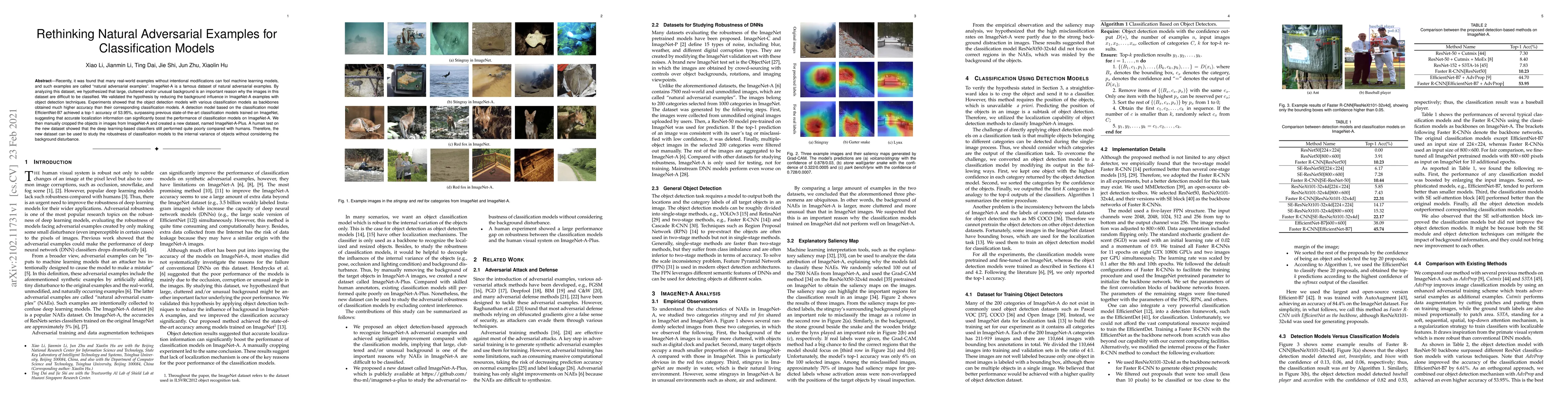 Recently, it was found that many real-world examples without intentional modifications can fool machine learning models, and such examples are called "natural adversarial examples". ImageNet-A is a famous dataset of natural adversarial examples. By analyzing this dataset, we hypothesized that large, cluttered and/or unusual background is an important reason why the images in this dataset are difficult to be classified. We validated the hypothesis by reducing the background influence in ImageNet-A examples with object detection techniques. Experiments showed that the object detection models with various classification models as backbones obtained much higher accuracy than their corresponding classification models. A detection model based on the classification model EfficientNet-B7 achieved a top-1 accuracy of 53.95%, surpassing previous state-of-the-art classification models trained on ImageNet, suggesting that accurate localization information can significantly boost the performance of classification models on ImageNet-A. We then manually cropped the objects in images from ImageNet-A and created a new dataset, named ImageNet-A-Plus. A human test on the new dataset showed that the deep learning-based classifiers still performed quite poorly compared with humans. Therefore, the new dataset can be used to study the robustness of classification models to the internal variance of objects without considering the background disturbance.