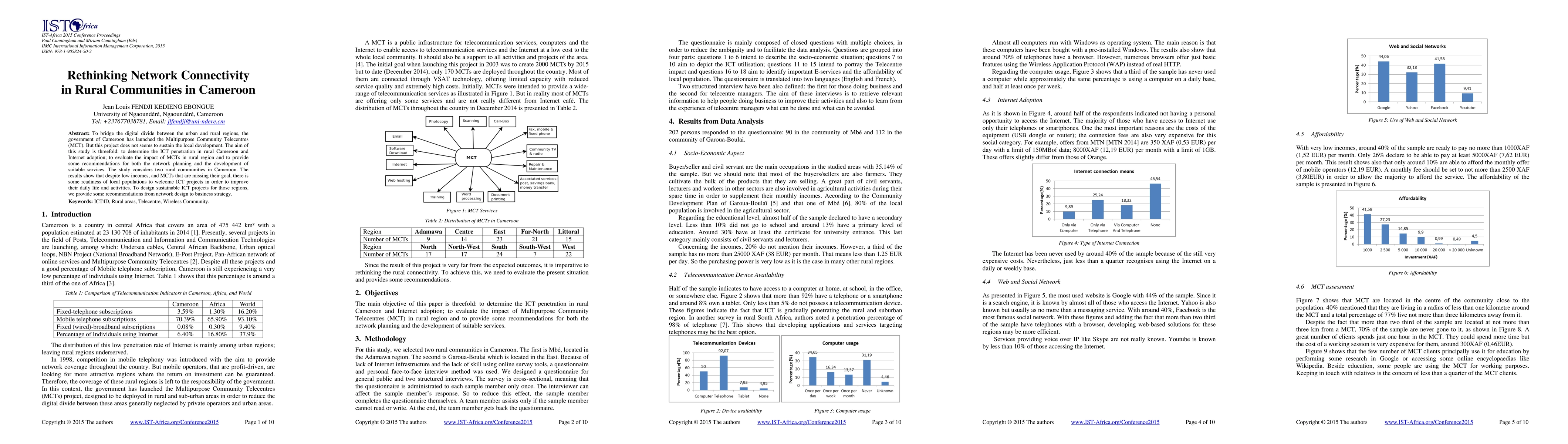 This study examines ICT penetration and Internet adoption in rural Cameroon, assessing the impact of Multipurpose Community Telecentres (MCTs) and offering recommendations for sustainable network planning and service development. Despite low incomes and underperforming MCTs, local populations show readiness to embrace ICTs for daily improvements.