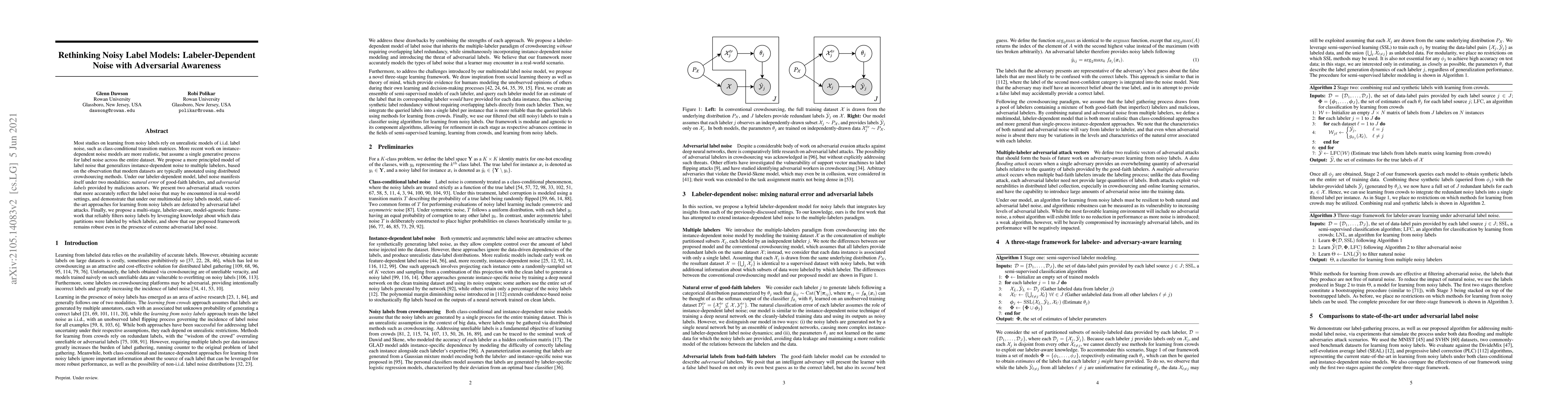 Most studies on learning from noisy labels rely on unrealistic models of i.i.d. label noise, such as class-conditional transition matrices. More recent work on instance-dependent noise models are more realistic, but assume a single generative process for label noise across the entire dataset. We propose a more principled model of label noise that generalizes instance-dependent noise to multiple labelers, based on the observation that modern datasets are typically annotated using distributed crowdsourcing methods. Under our labeler-dependent model, label noise manifests itself under two modalities: natural error of good-faith labelers, and adversarial labels provided by malicious actors. We present two adversarial attack vectors that more accurately reflect the label noise that may be encountered in real-world settings, and demonstrate that under our multimodal noisy labels model, state-of-the-art approaches for learning from noisy labels are defeated by adversarial label attacks. Finally, we propose a multi-stage, labeler-aware, model-agnostic framework that reliably filters noisy labels by leveraging knowledge about which data partitions were labeled by which labeler, and show that our proposed framework remains robust even in the presence of extreme adversarial label noise.