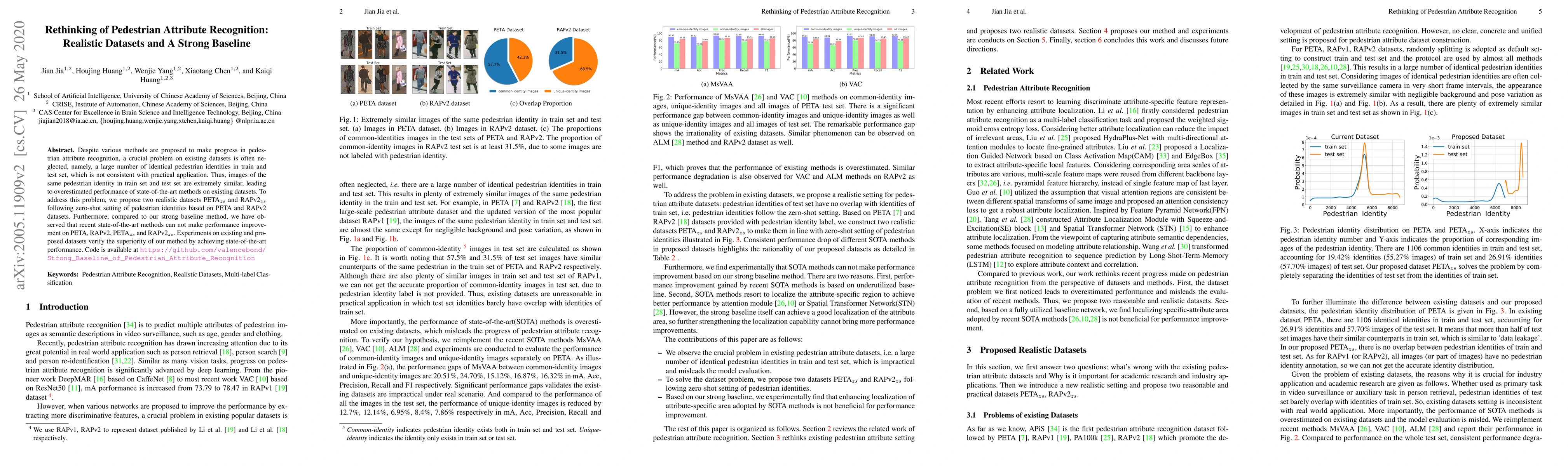 Despite various methods are proposed to make progress in pedestrian attribute recognition, a crucial problem on existing datasets is often neglected, namely, a large number of identical pedestrian identities in train and test set, which is not consistent with practical application. Thus, images of the same pedestrian identity in train set and test set are extremely similar, leading to overestimated performance of state-of-the-art methods on existing datasets. To address this problem, we propose two realistic datasets PETA\textsubscript{$zs$} and RAPv2\textsubscript{$zs$} following zero-shot setting of pedestrian identities based on PETA and RAPv2 datasets. Furthermore, compared to our strong baseline method, we have observed that recent state-of-the-art methods can not make performance improvement on PETA, RAPv2, PETA\textsubscript{$zs$} and RAPv2\textsubscript{$zs$}. Thus, through solving the inherent attribute imbalance in pedestrian attribute recognition, an efficient method is proposed to further improve the performance. Experiments on existing and proposed datasets verify the superiority of our method by achieving state-of-the-art performance.