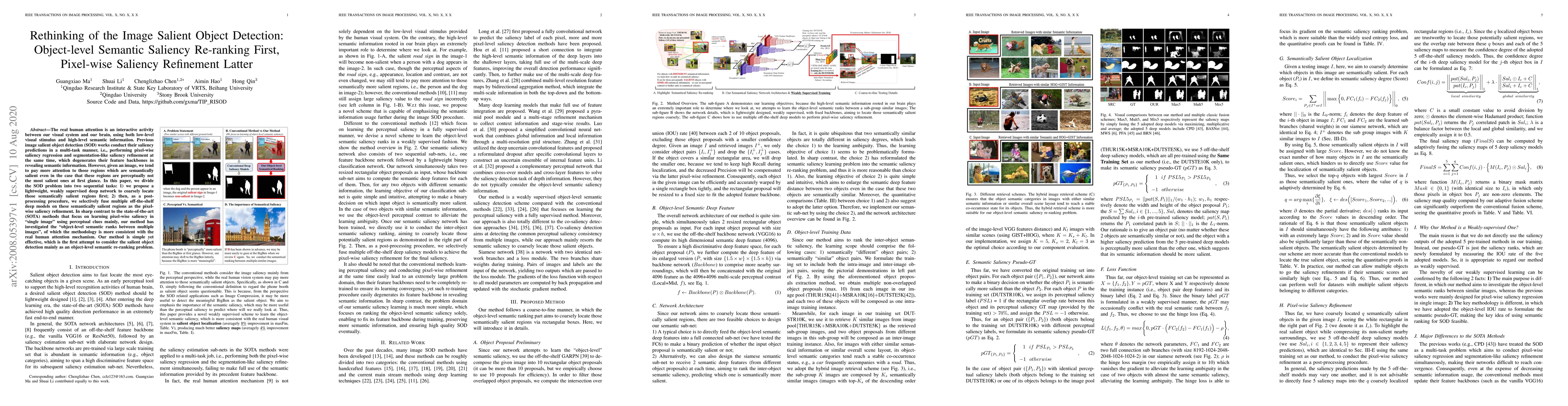 The real human attention is an interactive activity between our visual system and our brain, using both low-level visual stimulus and high-level semantic information. Previous image salient object detection (SOD) works conduct their saliency predictions in a multi-task manner, i.e., performing pixel-wise saliency regression and segmentation-like saliency refinement at the same time, which degenerates their feature backbones in revealing semantic information. However, given an image, we tend to pay more attention to those regions which are semantically salient even in the case that these regions are perceptually not the most salient ones at first glance. In this paper, we divide the SOD problem into two sequential tasks: 1) we propose a lightweight, weakly supervised deep network to coarsely locate those semantically salient regions first; 2) then, as a post-processing procedure, we selectively fuse multiple off-the-shelf deep models on these semantically salient regions as the pixel-wise saliency refinement. In sharp contrast to the state-of-the-art (SOTA) methods that focus on learning pixel-wise saliency in "single image" using perceptual clues mainly, our method has investigated the "object-level semantic ranks between multiple images", of which the methodology is more consistent with the real human attention mechanism. Our method is simple yet effective, which is the first attempt to consider the salient object detection mainly as an object-level semantic re-ranking problem.