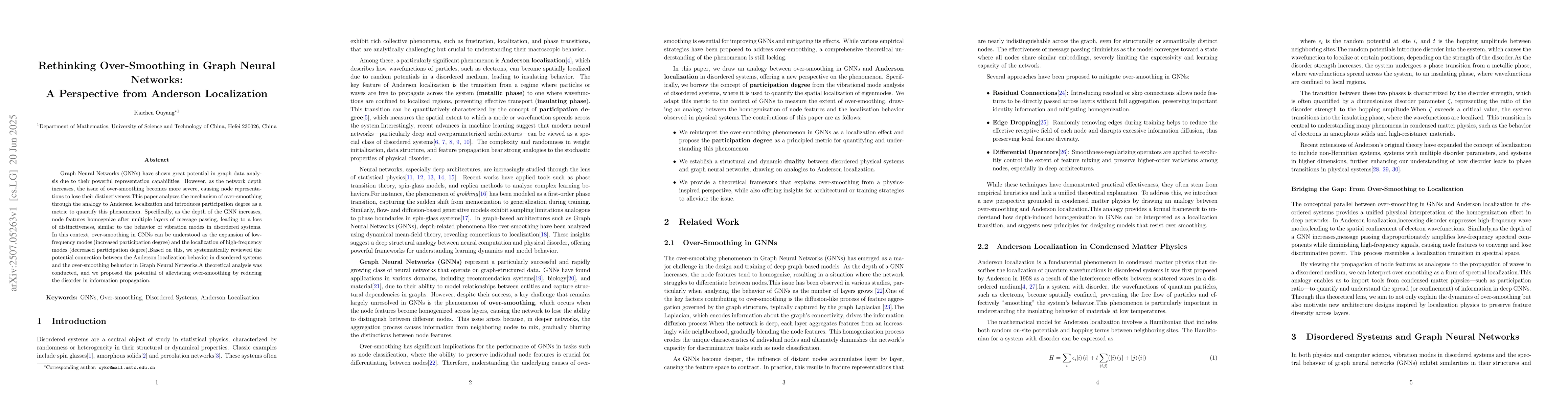 Graph Neural Networks (GNNs) have shown great potential in graph data analysis due to their powerful representation capabilities. However, as the network depth increases, the issue of over-smoothing becomes more severe, causing node representations to lose their distinctiveness. This paper analyzes the mechanism of over-smoothing through the analogy to Anderson localization and introduces participation degree as a metric to quantify this phenomenon. Specifically, as the depth of the GNN increases, node features homogenize after multiple layers of message passing, leading to a loss of distinctiveness, similar to the behavior of vibration modes in disordered systems. In this context, over-smoothing in GNNs can be understood as the expansion of low-frequency modes (increased participation degree) and the localization of high-frequency modes (decreased participation degree). Based on this, we systematically reviewed the potential connection between the Anderson localization behavior in disordered systems and the over-smoothing behavior in Graph Neural Networks. A theoretical analysis was conducted, and we proposed the potential of alleviating over-smoothing by reducing the disorder in information propagation.