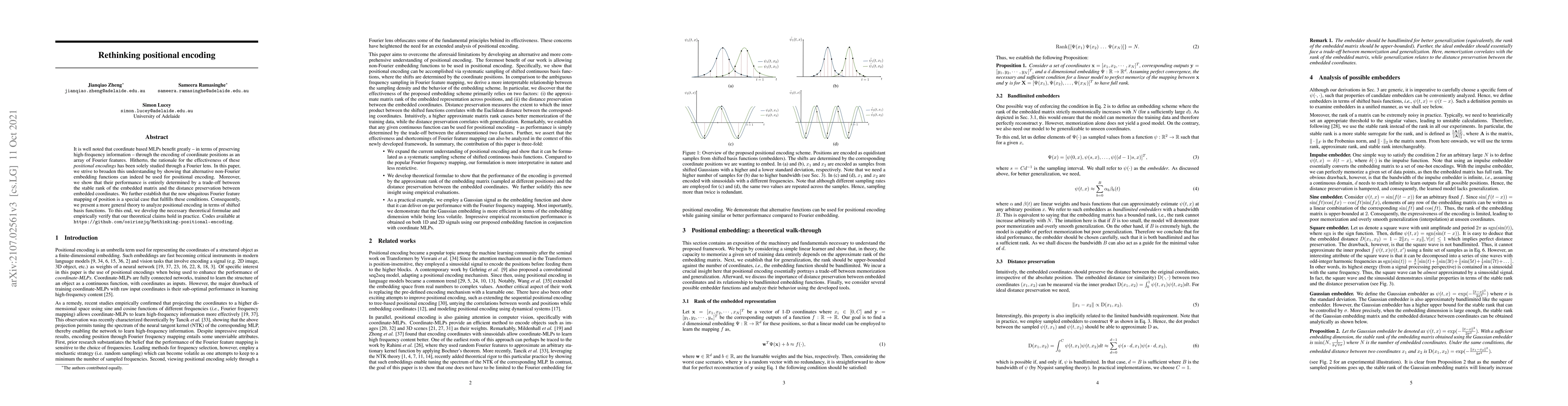 It is well noted that coordinate based MLPs benefit -- in terms of preserving high-frequency information -- through the encoding of coordinate positions as an array of Fourier features. Hitherto, the rationale for the effectiveness of these positional encodings has been solely studied through a Fourier lens. In this paper, we strive to broaden this understanding by showing that alternative non-Fourier embedding functions can indeed be used for positional encoding. Moreover, we show that their performance is entirely determined by a trade-off between the stable rank of the embedded matrix and the distance preservation between embedded coordinates. We further establish that the now ubiquitous Fourier feature mapping of position is a special case that fulfills these conditions. Consequently, we present a more general theory to analyze positional encoding in terms of shifted basis functions. To this end, we develop the necessary theoretical formulae and empirically verify that our theoretical claims hold in practice. Codes available at https://github.com/osiriszjq/Rethinking-positional-encoding.