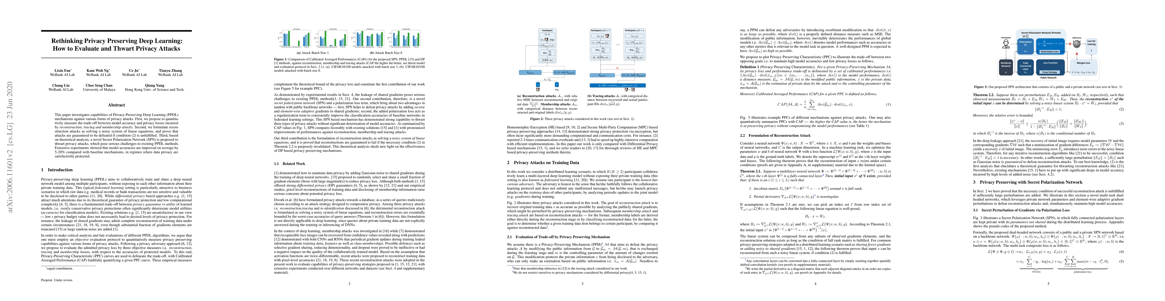 This paper investigates capabilities of Privacy-Preserving Deep Learning (PPDL) mechanisms against various forms of privacy attacks. First, we propose to quantitatively measure the trade-off between model accuracy and privacy losses incurred by reconstruction, tracing and membership attacks. Second, we formulate reconstruction attacks as solving a noisy system of linear equations, and prove that attacks are guaranteed to be defeated if condition (2) is unfulfilled. Third, based on theoretical analysis, a novel Secret Polarization Network (SPN) is proposed to thwart privacy attacks, which pose serious challenges to existing PPDL methods. Extensive experiments showed that model accuracies are improved on average by 5-20% compared with baseline mechanisms, in regimes where data privacy are satisfactorily protected.