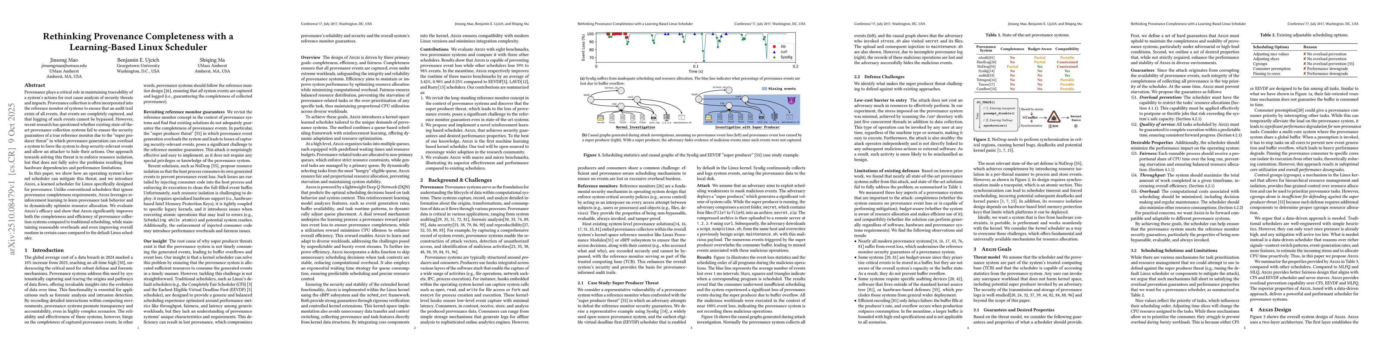 Aegis introduces a kernel-space learned scheduler that combines reinforcement learning with provenance-aware resource allocation to ensure event completeness and system security.