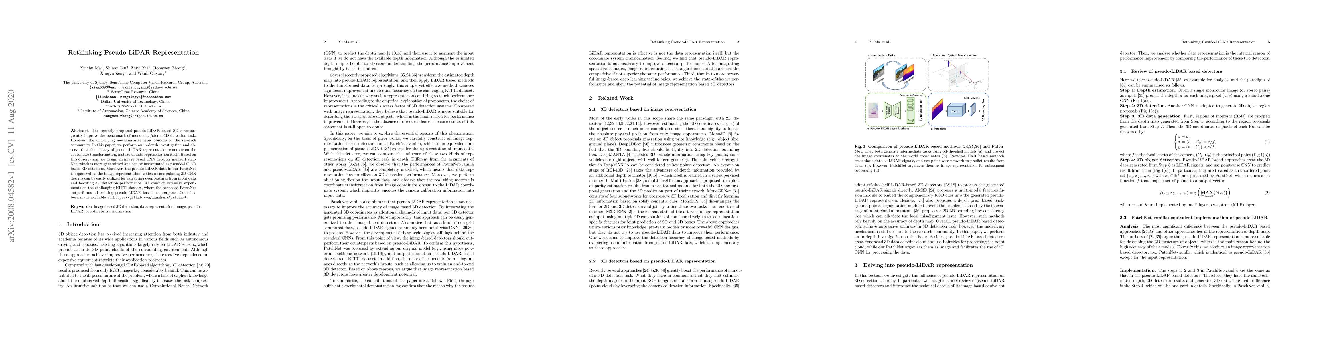 This paper investigates the effectiveness of pseudo-LiDAR representation in 3D detectors, finding that its success stems from coordinate transformation rather than data representation. The authors propose PatchNet, an image-based CNN detector that leverages existing 2D CNN designs, achieving superior performance on the KITTI dataset compared to other pseudo-LiDAR methods.