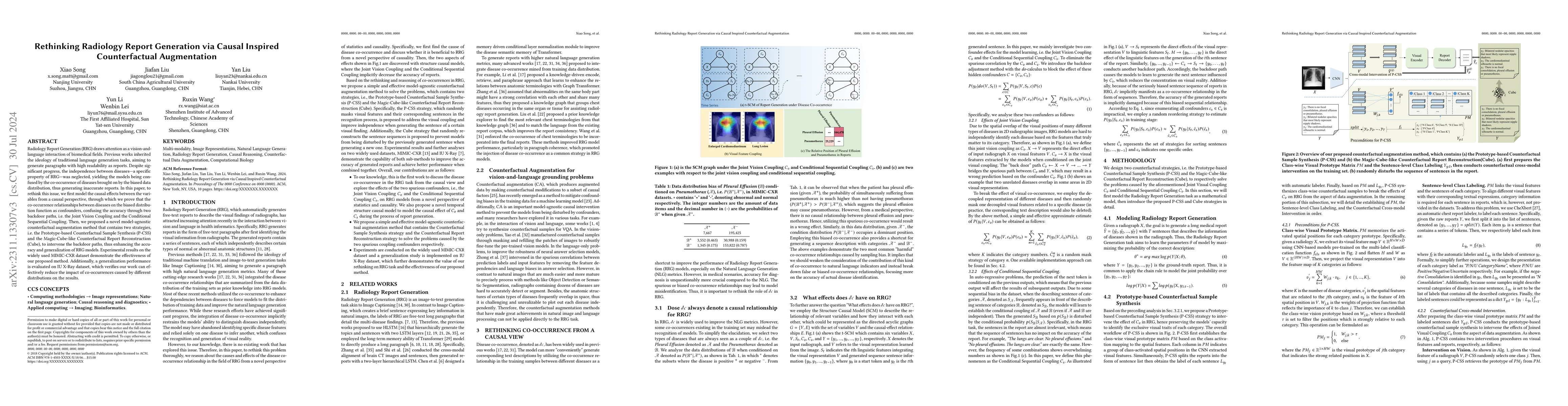 This paper addresses the issue of biased data distribution in Radiology Report Generation by introducing a causal reasoning approach and counterfactual augmentation to mitigate the effects of disease co-occurrence as a confounder. The proposed method aims to improve report accuracy by breaking down the spurious effects of joint vision coupling and conditional sentence coherence coupling.