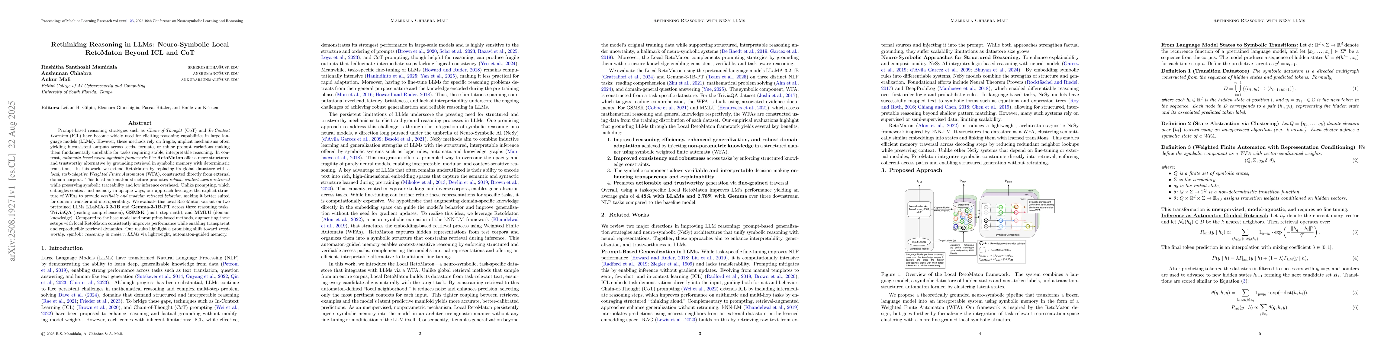 Prompt-based reasoning strategies such as Chain-of-Thought (CoT) and In-Context Learning (ICL) have become widely used for eliciting reasoning capabilities in large language models (LLMs). However, these methods rely on fragile, implicit mechanisms often yielding inconsistent outputs across seeds, formats, or minor prompt variations making them fundamentally unreliable for tasks requiring stable, interpretable reasoning. In contrast, automata-based neuro-symbolic frameworks like RetoMaton offer a more structured and trustworthy alternative by grounding retrieval in symbolic memory with deterministic transitions. In this work, we extend RetoMaton by replacing its global datastore with a local, task-adaptive Weighted Finite Automaton (WFA), constructed directly from external domain corpora. This local automaton structure promotes robust, context-aware retrieval while preserving symbolic traceability and low inference overhead. Unlike prompting, which entangles context and memory in opaque ways, our approach leverages the explicit structure of WFAs to provide verifiable and modular retrieval behavior, making it better suited for domain transfer and interoperability. We evaluate this local RetoMaton variant on two pretrained LLMs LLaMA-3.2-1B and Gemma-3-1B-PT across three reasoning tasks: TriviaQA (reading comprehension), GSM8K (multi-step math), and MMLU (domain knowledge). Compared to the base model and prompting-based methods, augmenting these setups with local RetoMaton consistently improves performance while enabling transparent and reproducible retrieval dynamics. Our results highlight a promising shift toward trustworthy, symbolic reasoning in modern LLMs via lightweight, automaton-guided memory.