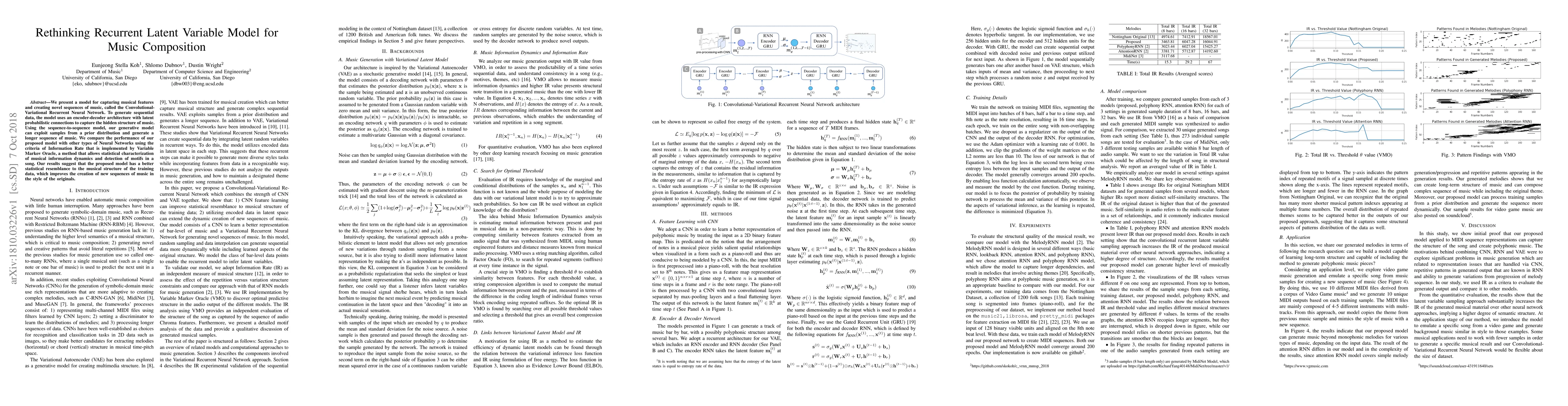 We present a model for capturing musical features and creating novel sequences of music, called the Convolutional Variational Recurrent Neural Network. To generate sequential data, the model uses an encoder-decoder architecture with latent probabilistic connections to capture the hidden structure of music. Using the sequence-to-sequence model, our generative model can exploit samples from a prior distribution and generate a longer sequence of music. We compare the performance of our proposed model with other types of Neural Networks using the criteria of Information Rate that is implemented by Variable Markov Oracle, a method that allows statistical characterization of musical information dynamics and detection of motifs in a song. Our results suggest that the proposed model has a better statistical resemblance to the musical structure of the training data, which improves the creation of new sequences of music in the style of the originals.