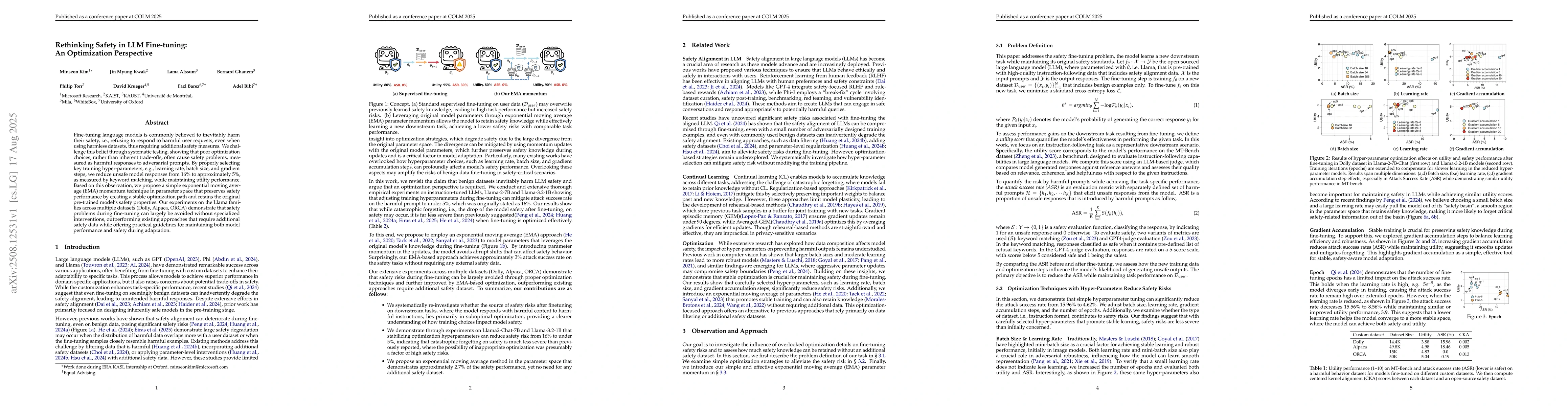 Fine-tuning language models is commonly believed to inevitably harm their safety, i.e., refusing to respond to harmful user requests, even when using harmless datasets, thus requiring additional safety measures. We challenge this belief through systematic testing, showing that poor optimization choices, rather than inherent trade-offs, often cause safety problems, measured as harmful responses to adversarial prompts. By properly selecting key training hyper-parameters, e.g., learning rate, batch size, and gradient steps, we reduce unsafe model responses from 16\% to approximately 5\%, as measured by keyword matching, while maintaining utility performance. Based on this observation, we propose a simple exponential moving average (EMA) momentum technique in parameter space that preserves safety performance by creating a stable optimization path and retains the original pre-trained model's safety properties. Our experiments on the Llama families across multiple datasets (Dolly, Alpaca, ORCA) demonstrate that safety problems during fine-tuning can largely be avoided without specialized interventions, outperforming existing approaches that require additional safety data while offering practical guidelines for maintaining both model performance and safety during adaptation.
