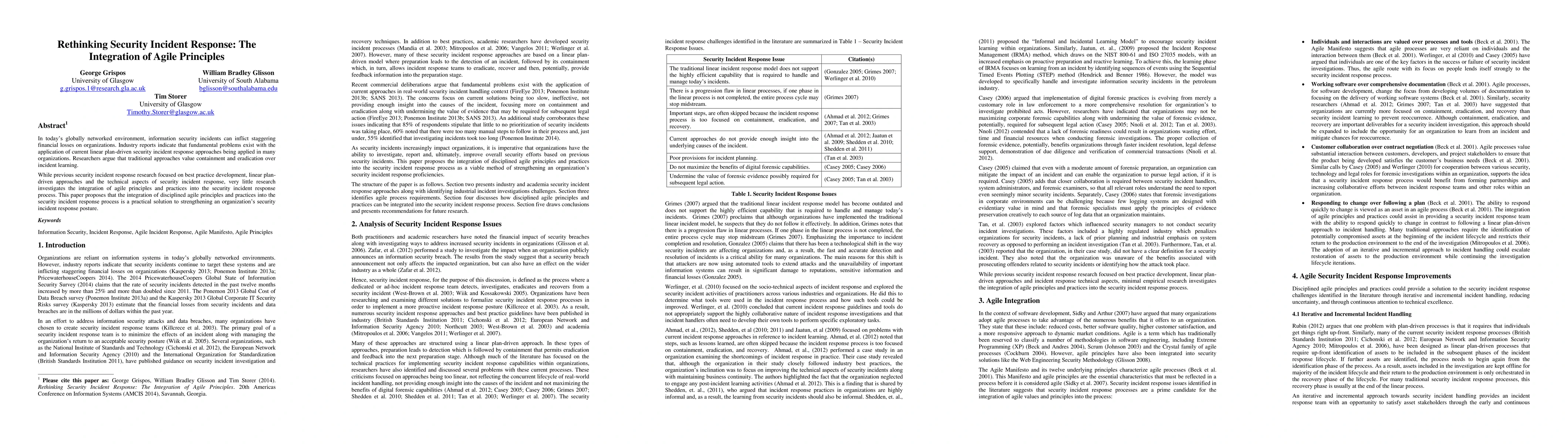 This paper argues that traditional linear plan-driven security incident response methods are inadequate and proposes integrating agile principles to enhance incident learning and response effectiveness. The integration of disciplined agile practices aims to improve an organization's security posture and incident response capabilities.