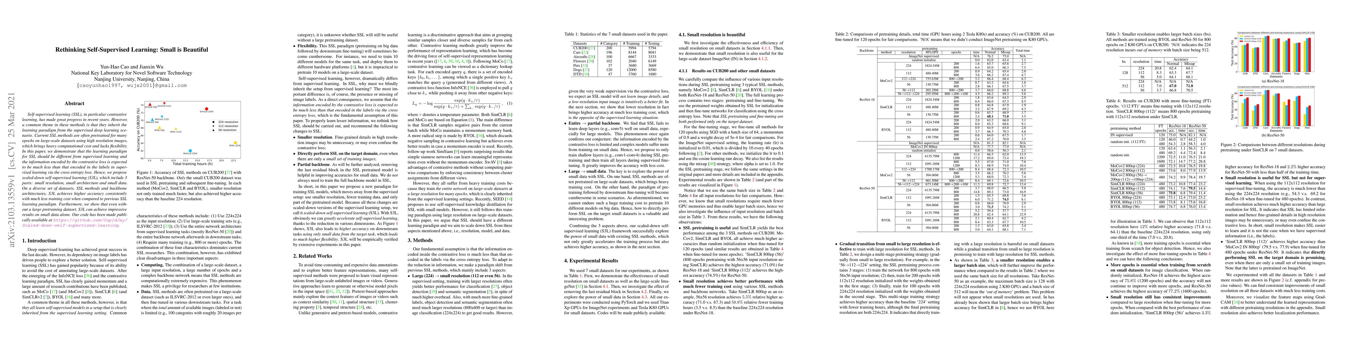 This paper proposes scaled-down self-supervised learning (S3L) that utilizes small resolution, small architecture, and small data to achieve higher accuracy with lower computational costs compared to traditional SSL methods. S3L demonstrates impressive results even on small datasets without large pretraining data.