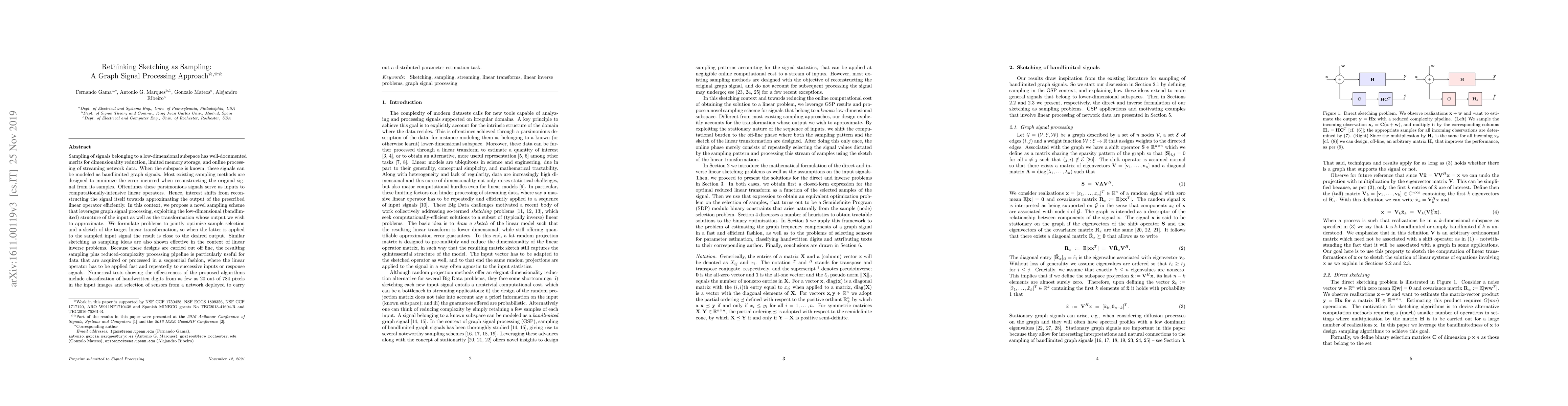 This paper proposes a novel sampling scheme using graph signal processing for dimensionality reduction and efficient processing of streaming data. It optimizes sample selection and a sketch of linear transformations to approximate outputs rather than reconstructing the original signal, demonstrating effectiveness through handwritten digit classification and sensor selection tasks.