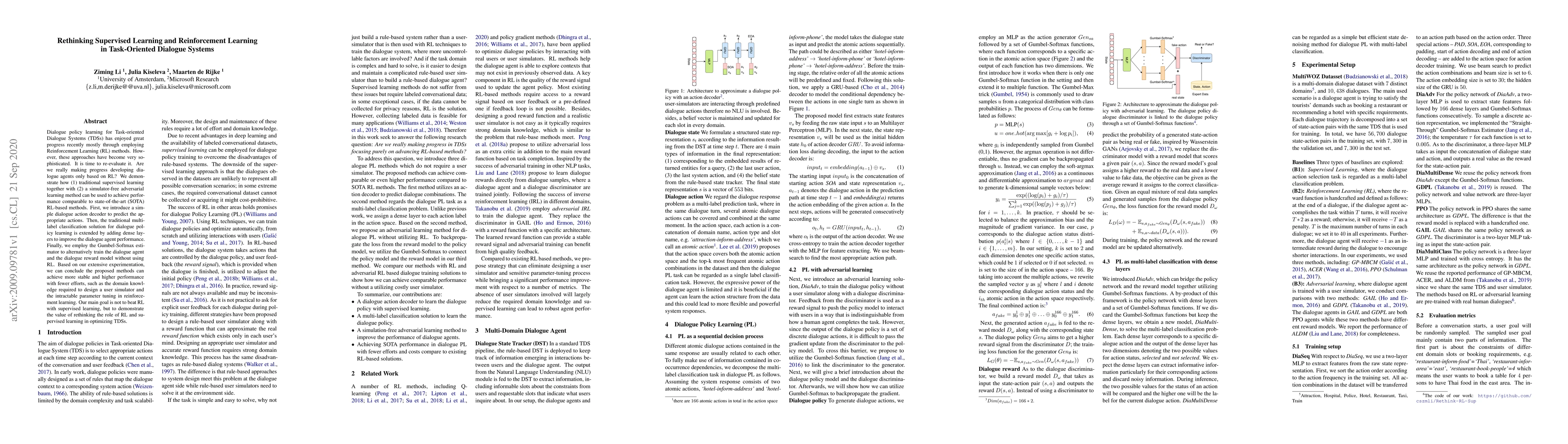 Dialogue policy learning for task-oriented dialogue systems has enjoyed great progress recently mostly through employing reinforcement learning methods. However, these approaches have become very sophisticated. It is time to re-evaluate it. Are we really making progress developing dialogue agents only based on reinforcement learning? We demonstrate how (1)~traditional supervised learning together with (2)~a simulator-free adversarial learning method can be used to achieve performance comparable to state-of-the-art RL-based methods. First, we introduce a simple dialogue action decoder to predict the appropriate actions. Then, the traditional multi-label classification solution for dialogue policy learning is extended by adding dense layers to improve the dialogue agent performance. Finally, we employ the Gumbel-Softmax estimator to alternatively train the dialogue agent and the dialogue reward model without using reinforcement learning. Based on our extensive experimentation, we can conclude the proposed methods can achieve more stable and higher performance with fewer efforts, such as the domain knowledge required to design a user simulator and the intractable parameter tuning in reinforcement learning. Our main goal is not to beat reinforcement learning with supervised learning, but to demonstrate the value of rethinking the role of reinforcement learning and supervised learning in optimizing task-oriented dialogue systems.