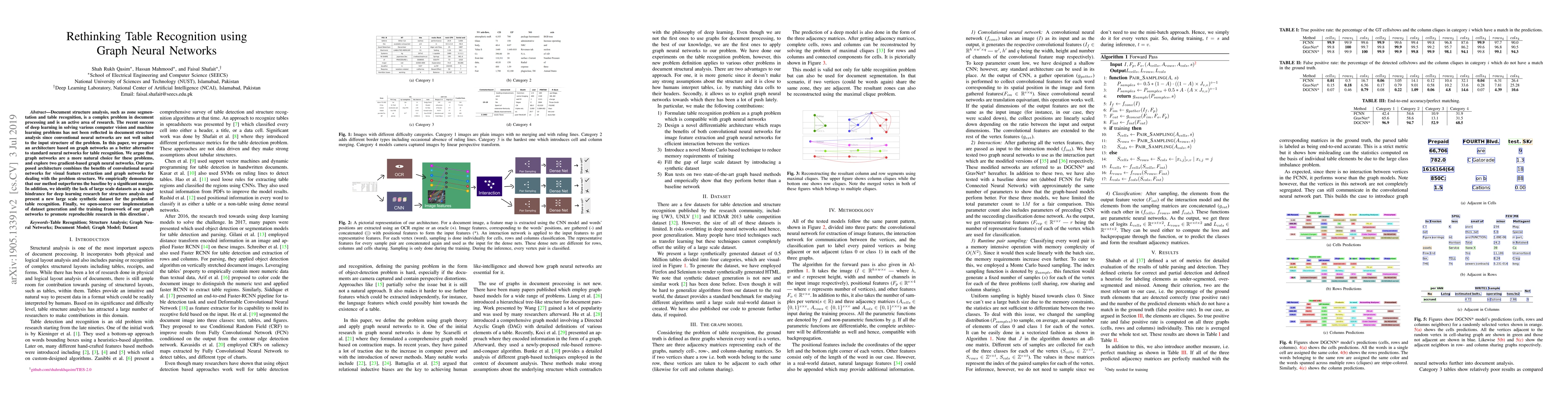 This paper proposes a graph neural network architecture for table recognition, arguing that it better suits the problem's structure compared to conventional neural networks. The authors demonstrate significant performance improvements and address the lack of large datasets by introducing a new synthetic dataset, aiming to advance research in document structure analysis.