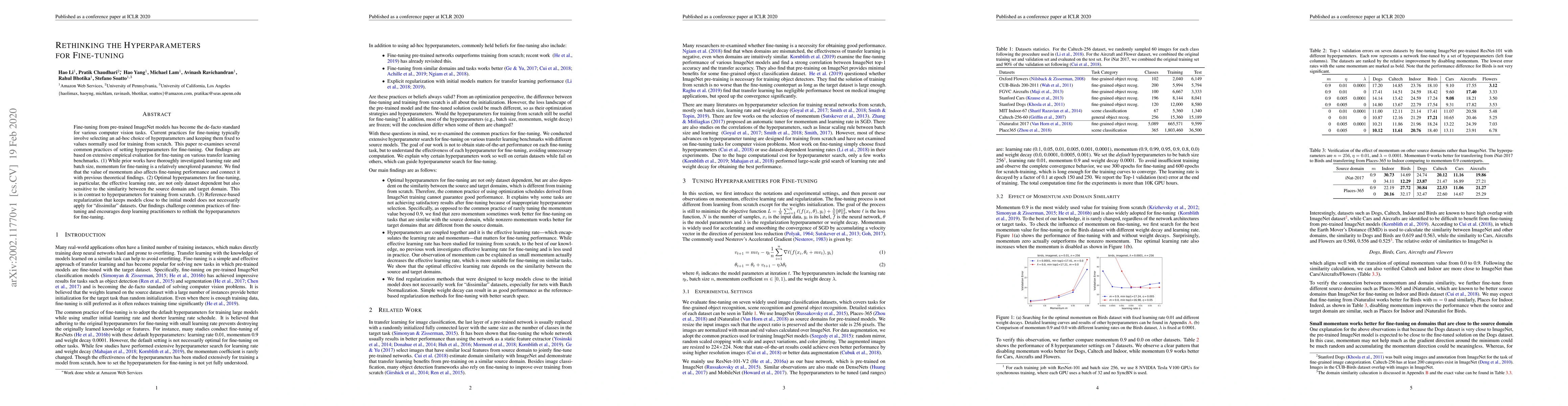 This paper challenges conventional fine-tuning practices by demonstrating that momentum and effective learning rate are crucial hyperparameters for fine-tuning pre-trained ImageNet models, with their optimal values being dataset-dependent and sensitive to domain similarity. It suggests rethinking hyperparameter settings for better transfer learning performance.