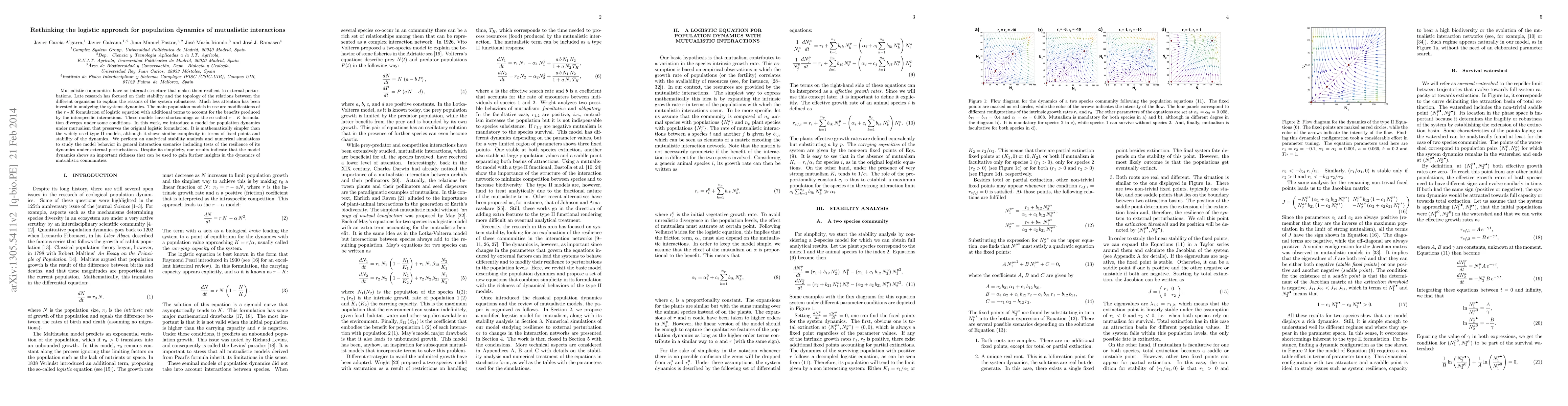 Mutualistic communities have an internal structure that makes them resilient to external per- turbations. Late research has focused on their stability and the topology of the relations between the different organisms to explain the reasons of the system robustness. Much less attention has been invested in analyzing the systems dynamics. The main population models in use are modifi- cations of the logistic equation with additional terms to account for the benefits produced by the interspecific interactions. These models have shortcomings as the so called r - K formulation of logistic equation diverges under some conditions. In this work, we introduce a model for population dynamics under mutualism inspired by the logistic equation but avoiding singularities. The model is mathematically simpler than the widely used type II models, although it shows similar complexity in terms of fixed points and stability of the dynamics. Furthermore, each term of our model has a more direct ecological interpretation, which can facilitate the measurement of the rates involved in field campaigns. We perform an analytical stability analysis and numerical simulations to study the model behavior in more general interaction scenarios including tests of the resilience of its dynamics under external perturbations. Despite its simplicity, our results indicate that the model dynamics shows an important richness that can be used to gain further insights in the dynamics of mutualistic communities.