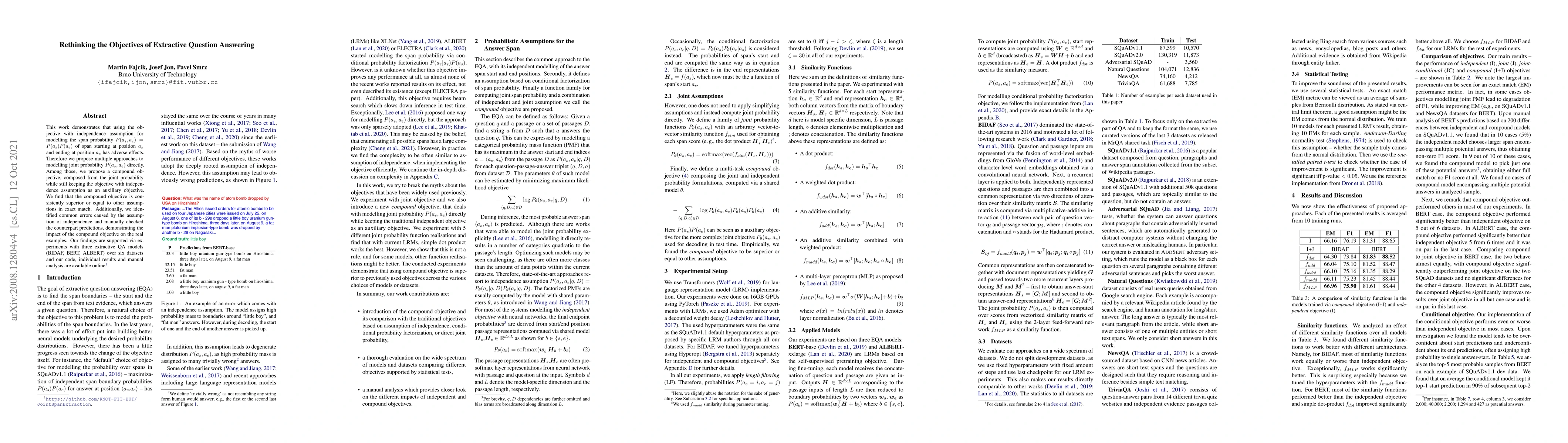 This work demonstrates that using the objective with independence assumption for modelling the span probability $P(a_s,a_e) = P(a_s)P(a_e)$ of span starting at position $a_s$ and ending at position $a_e$ has adverse effects. Therefore we propose multiple approaches to modelling joint probability $P(a_s,a_e)$ directly. Among those, we propose a compound objective, composed from the joint probability while still keeping the objective with independence assumption as an auxiliary objective. We find that the compound objective is consistently superior or equal to other assumptions in exact match. Additionally, we identified common errors caused by the assumption of independence and manually checked the counterpart predictions, demonstrating the impact of the compound objective on the real examples. Our findings are supported via experiments with three extractive QA models (BIDAF, BERT, ALBERT) over six datasets and our code, individual results and manual analysis are available online.