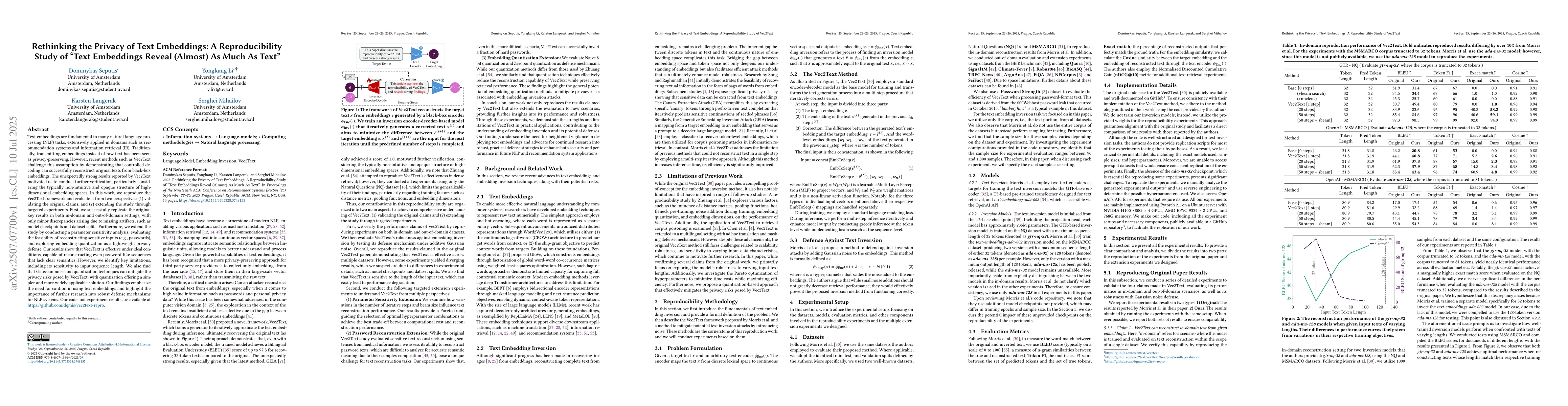 Text embeddings are fundamental to many natural language processing (NLP) tasks, extensively applied in domains such as recommendation systems and information retrieval (IR). Traditionally, transmitting embeddings instead of raw text has been seen as privacy-preserving. However, recent methods such as Vec2Text challenge this assumption by demonstrating that controlled decoding can successfully reconstruct original texts from black-box embeddings. The unexpectedly strong results reported by Vec2Text motivated us to conduct further verification, particularly considering the typically non-intuitive and opaque structure of high-dimensional embedding spaces. In this work, we reproduce the Vec2Text framework and evaluate it from two perspectives: (1) validating the original claims, and (2) extending the study through targeted experiments. First, we successfully replicate the original key results in both in-domain and out-of-domain settings, with only minor discrepancies arising due to missing artifacts, such as model checkpoints and dataset splits. Furthermore, we extend the study by conducting a parameter sensitivity analysis, evaluating the feasibility of reconstructing sensitive inputs (e.g., passwords), and exploring embedding quantization as a lightweight privacy defense. Our results show that Vec2Text is effective under ideal conditions, capable of reconstructing even password-like sequences that lack clear semantics. However, we identify key limitations, including its sensitivity to input sequence length. We also find that Gaussian noise and quantization techniques can mitigate the privacy risks posed by Vec2Text, with quantization offering a simpler and more widely applicable solution. Our findings emphasize the need for caution in using text embeddings and highlight the importance of further research into robust defense mechanisms for NLP systems.