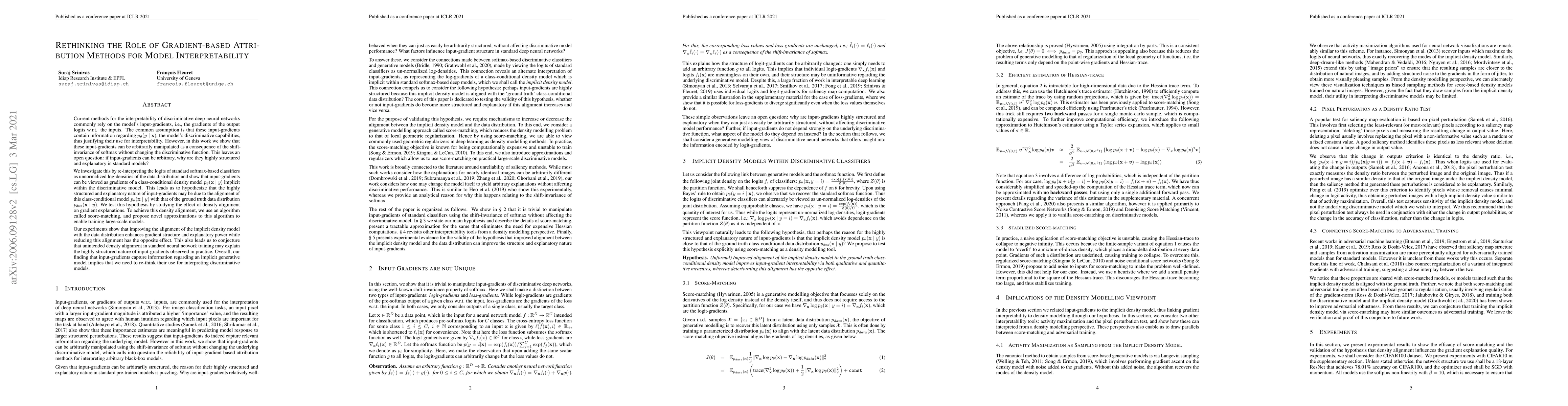 Current methods for the interpretability of discriminative deep neural networks commonly rely on the model's input-gradients, i.e., the gradients of the output logits w.r.t. the inputs. The common assumption is that these input-gradients contain information regarding $p_{\theta} ( y \mid x)$, the model's discriminative capabilities, thus justifying their use for interpretability. However, in this work we show that these input-gradients can be arbitrarily manipulated as a consequence of the shift-invariance of softmax without changing the discriminative function. This leaves an open question: if input-gradients can be arbitrary, why are they highly structured and explanatory in standard models? We investigate this by re-interpreting the logits of standard softmax-based classifiers as unnormalized log-densities of the data distribution and show that input-gradients can be viewed as gradients of a class-conditional density model $p_{\theta}(x \mid y)$ implicit within the discriminative model. This leads us to hypothesize that the highly structured and explanatory nature of input-gradients may be due to the alignment of this class-conditional model $p_{\theta}(x \mid y)$ with that of the ground truth data distribution $p_{\text{data}} (x \mid y)$. We test this hypothesis by studying the effect of density alignment on gradient explanations. To achieve this alignment we use score-matching, and propose novel approximations to this algorithm to enable training large-scale models. Our experiments show that improving the alignment of the implicit density model with the data distribution enhances gradient structure and explanatory power while reducing this alignment has the opposite effect. Overall, our finding that input-gradients capture information regarding an implicit generative model implies that we need to re-think their use for interpreting discriminative models.