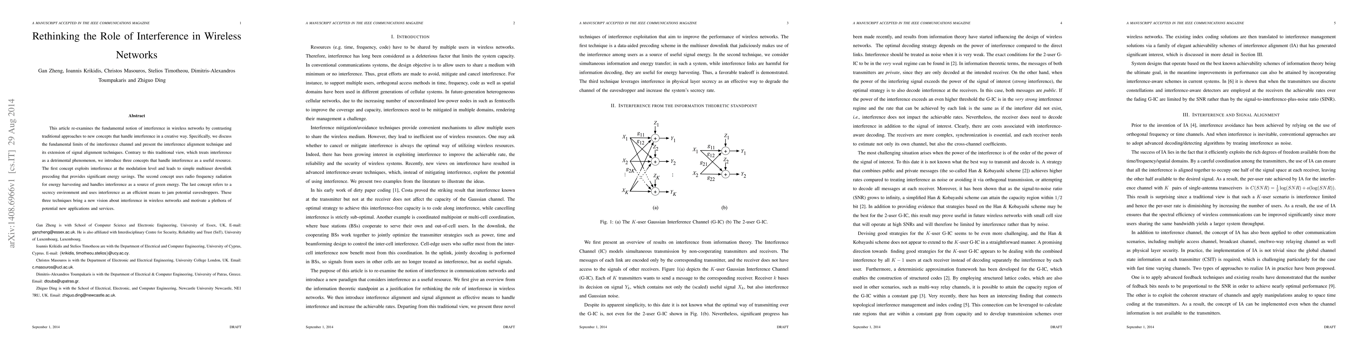 This paper re-evaluates interference in wireless networks, proposing innovative methods to leverage it as a beneficial resource rather than a hindrance. It introduces interference alignment and signal alignment techniques, along with applications in energy savings, green energy harvesting, and eavesdropping prevention.