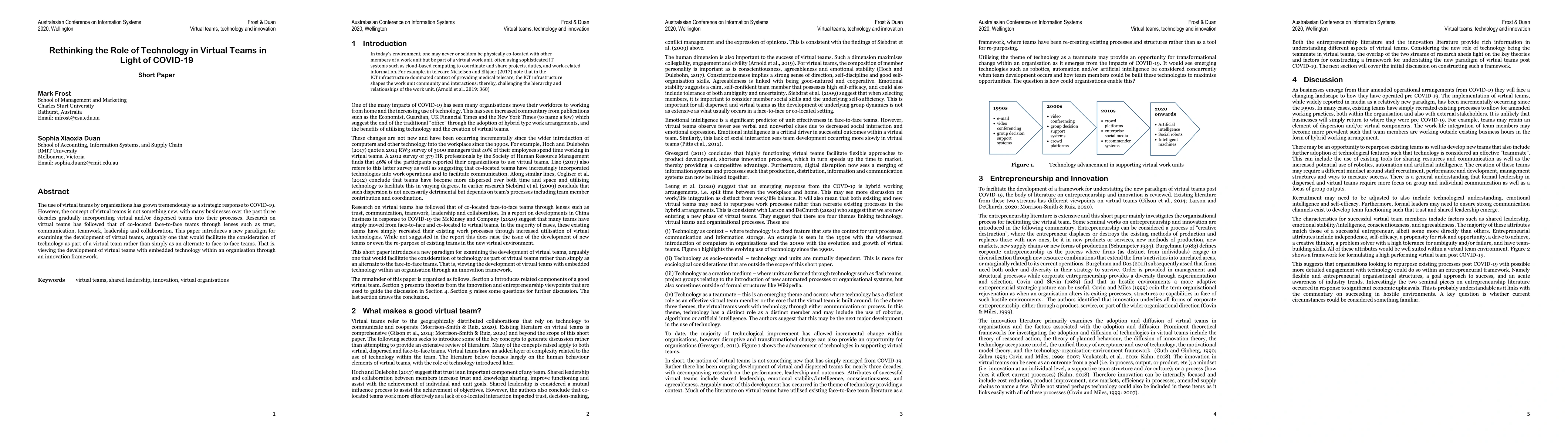 This paper explores the evolving role of technology in virtual teams, especially in the context of COVID-19, proposing a new paradigm that integrates technology as an integral part of virtual team development rather than a mere substitute for face-to-face interactions. It suggests viewing virtual teams through an innovation framework.