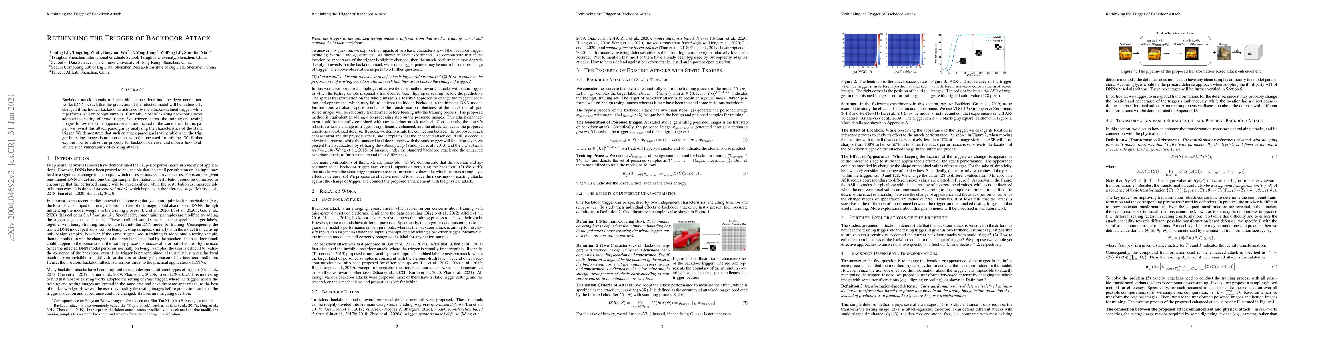 The paper analyzes the vulnerability of static triggers in backdoor attacks by examining the characteristics of triggers in training and testing images, proposing transformation-based defenses, and enhancing backdoor attacks with random spatial transformations.