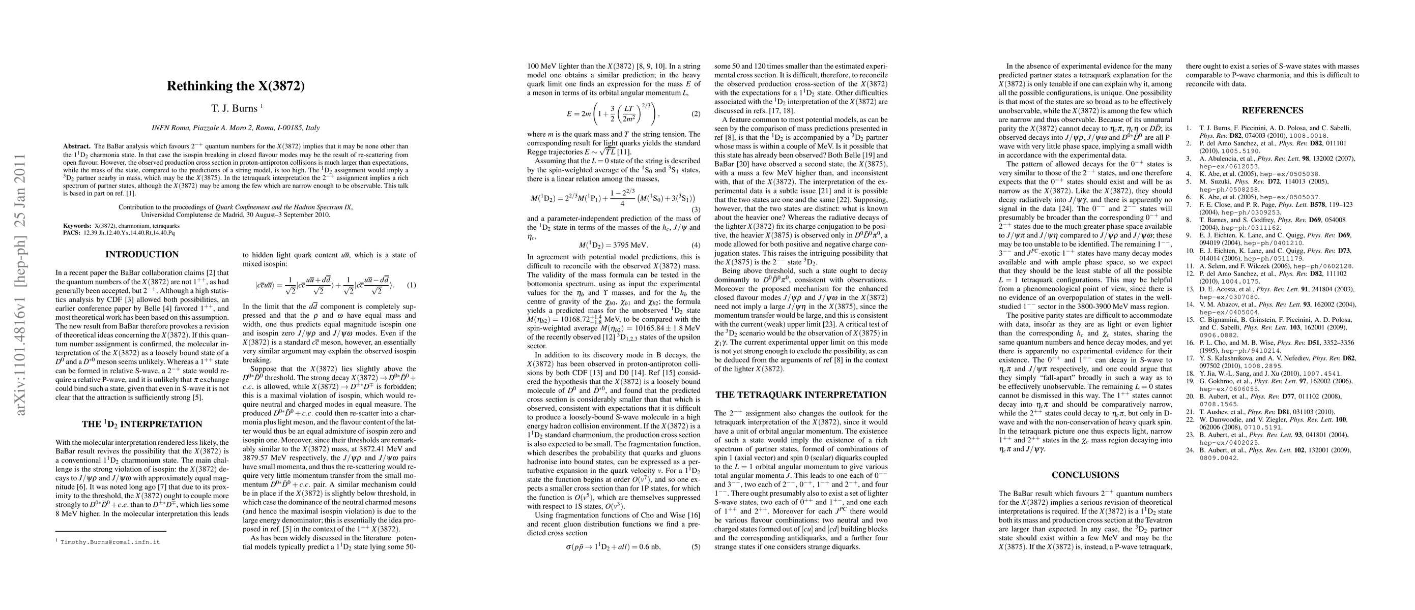 The BaBar analysis which favours $2^{-+}$ quantum numbers for the X(3872) implies that it may be none other than the 1D2 charmonia state. In that case the isospin breaking in closed flavour modes may be the result of re-scattering from open flavour. However, the observed production cross section in proton-antiproton collisions is much larger than expectations, while the mass of the state, compared to the predictions of a string model, is too high. The 1D2 assignment would imply a 3D2 partner nearby in mass, which may be the X(3875). In the tetraquark interpretation the $2^{-+}$ assignment implies a rich spectrum of partner states, although the X(3872) may be among the few which are narrow enough to be observable. This talk is based in part on "The 2-+ assignment for the X(3872)" by T. J. Burns, F. Piccinini, A. D. Polosa & C. Sabelli (Phys. Rev. D 82, 074003 (2010); arXiv:1008.0018 [hep-ph]).