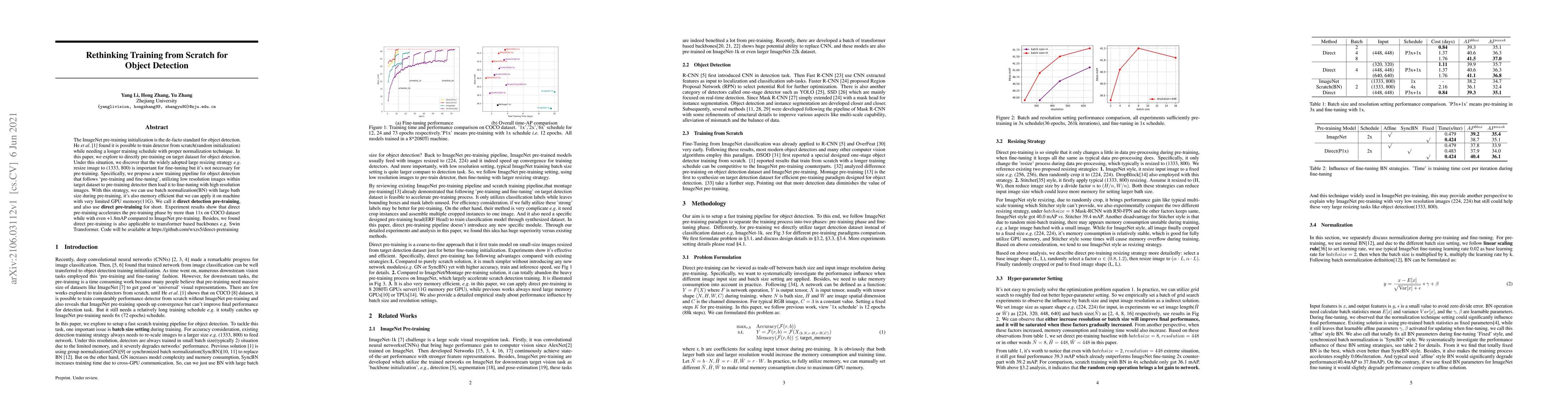 This paper proposes a new training pipeline for object detection called direct detection pre-training, which pre-trains on low resolution images and fine-tunes using high resolution images, significantly accelerating the pre-training phase by over 11x and improving mAP by +1.8 compared to ImageNet pre-training. The method is also memory efficient and applicable to transformer-based backbones.