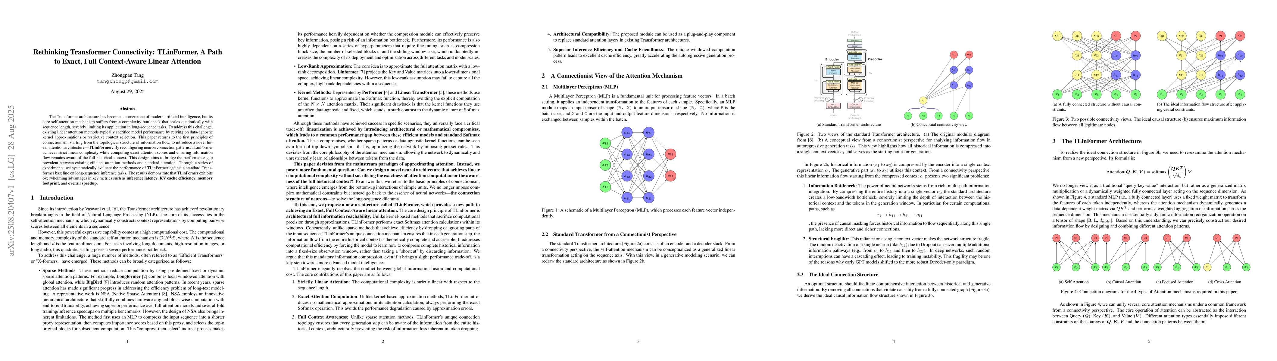 The Transformer architecture has become a cornerstone of modern artificial intelligence, but its core self-attention mechanism suffers from a complexity bottleneck that scales quadratically with sequence length, severely limiting its application in long-sequence tasks. To address this challenge, existing linear attention methods typically sacrifice model performance by relying on data-agnostic kernel approximations or restrictive context selection. This paper returns to the first principles of connectionism, starting from the topological structure of information flow, to introduce a novel linear attention architecture-\textbf{TLinFormer}. By reconfiguring neuron connection patterns, TLinFormer achieves strict linear complexity while computing exact attention scores and ensuring information flow remains aware of the full historical context. This design aims to bridge the performance gap prevalent between existing efficient attention methods and standard attention. Through a series of experiments, we systematically evaluate the performance of TLinFormer against a standard Transformer baseline on long-sequence inference tasks. The results demonstrate that TLinFormer exhibits overwhelming advantages in key metrics such as \textbf{inference latency}, \textbf{KV cache efficiency}, \textbf{memory footprint}, and \textbf{overall speedup}.