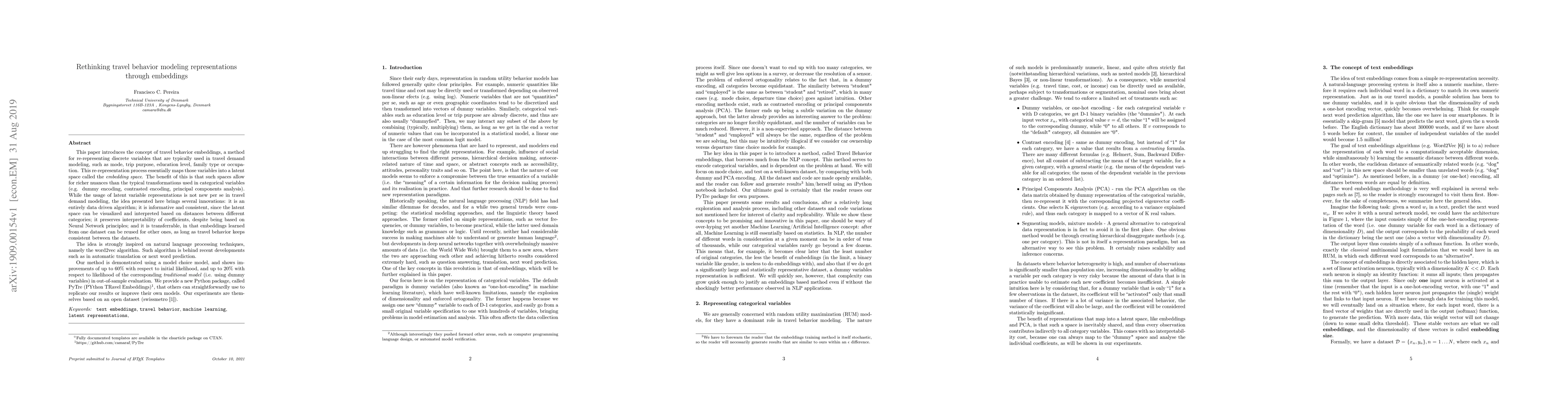 This paper introduces the concept of travel behavior embeddings, a method for re-representing discrete variables that are typically used in travel demand modeling, such as mode, trip purpose, education level, family type or occupation. This re-representation process essentially maps those variables into a latent space called the \emph{embedding space}. The benefit of this is that such spaces allow for richer nuances than the typical transformations used in categorical variables (e.g. dummy encoding, contrasted encoding, principal components analysis). While the usage of latent variable representations is not new per se in travel demand modeling, the idea presented here brings several innovations: it is an entirely data driven algorithm; it is informative and consistent, since the latent space can be visualized and interpreted based on distances between different categories; it preserves interpretability of coefficients, despite being based on Neural Network principles; and it is transferrable, in that embeddings learned from one dataset can be reused for other ones, as long as travel behavior keeps consistent between the datasets. The idea is strongly inspired on natural language processing techniques, namely the word2vec algorithm. Such algorithm is behind recent developments such as in automatic translation or next word prediction. Our method is demonstrated using a model choice model, and shows improvements of up to 60\% with respect to initial likelihood, and up to 20% with respect to likelihood of the corresponding traditional model (i.e. using dummy variables) in out-of-sample evaluation. We provide a new Python package, called PyTre (PYthon TRavel Embeddings), that others can straightforwardly use to replicate our results or improve their own models. Our experiments are themselves based on an open dataset (swissmetro).