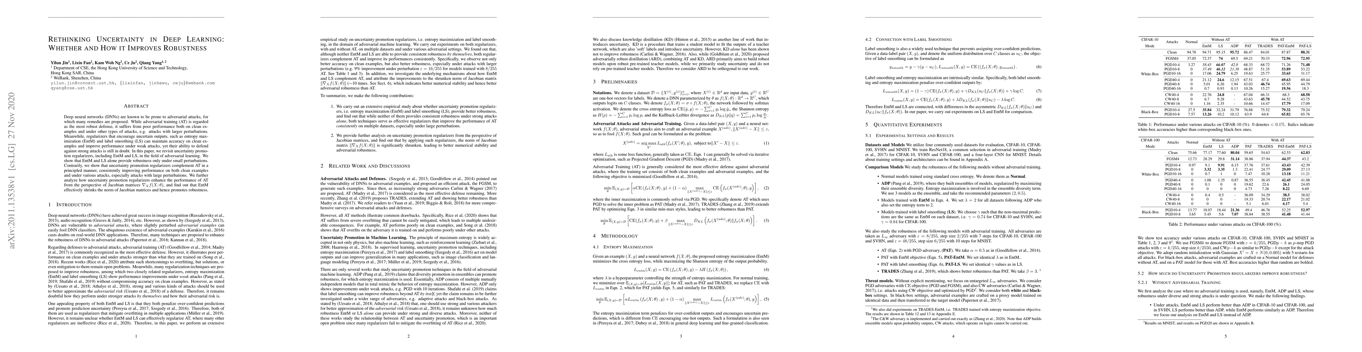 Researchers found that uncertainty promotion regularizers like entropy maximization and label smoothing can improve deep learning model robustness, especially against strong attacks, when used in conjunction with adversarial training.