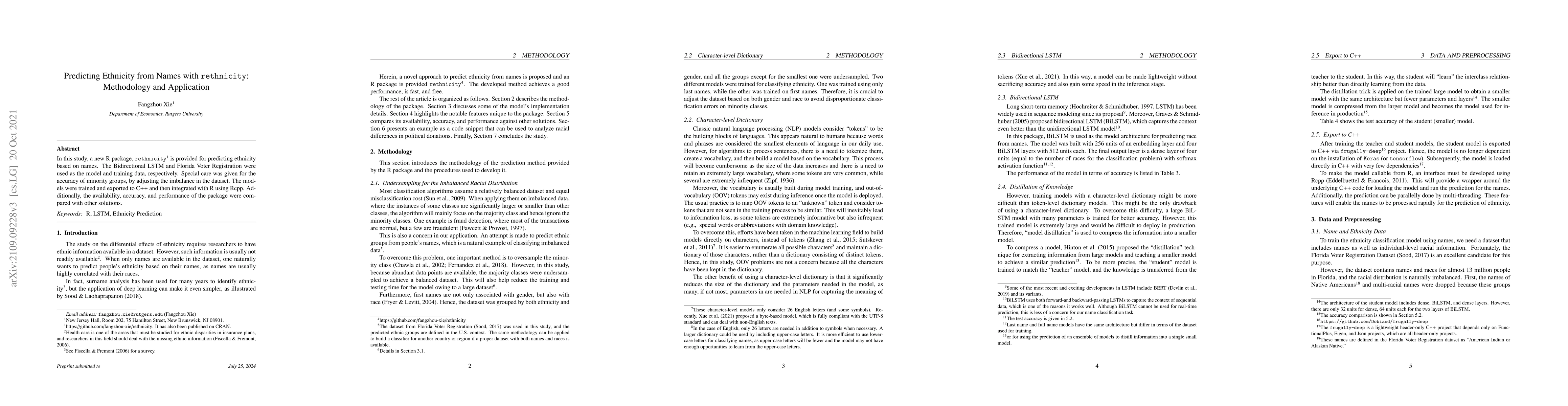 In this study, a new R package, \texttt{rethnicity} is provided for predicting ethnicity based on names. The Bidirectional LSTM and Florida Voter Registration were used as the model and training data, respectively. Special care was given for the accuracy of minority groups, by adjusting the imbalance in the dataset. The models were trained and exported to C++ and then integrated with R using Rcpp. Additionally, the availability, accuracy, and performance of the package were compared with other solutions.