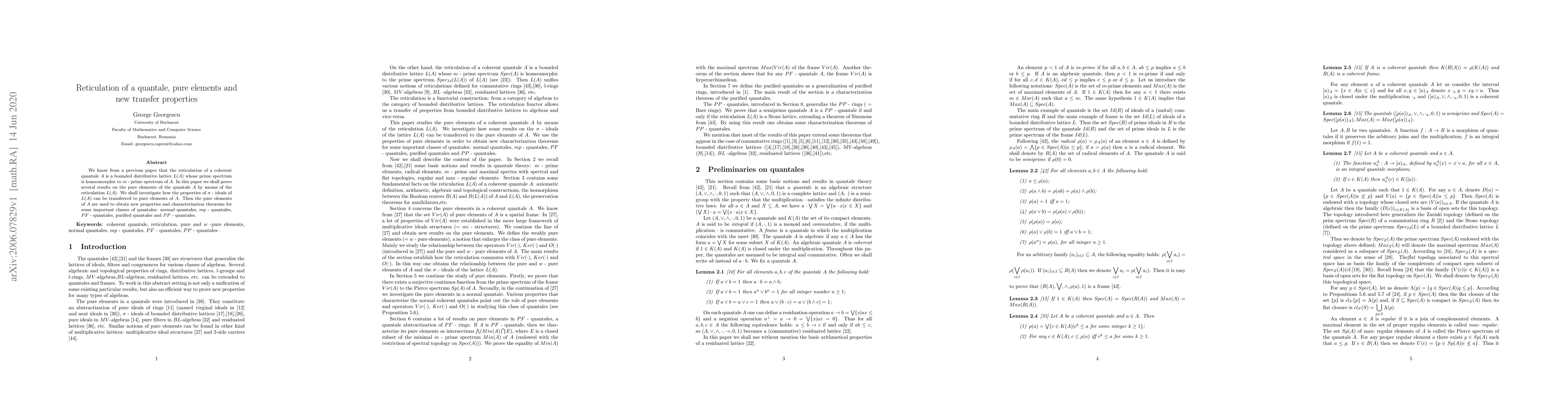 We know from a previous paper that the reticulation of a coherent quantale $A$ is a bounded distributive lattice $L(A)$ whose prime spectrum is homeomorphic to $m$ - prime spectrum of $A$. In this paper we shall prove several results on the pure elements of the quantale $A$ by means of the reticulation $L(A)$. We shall investigate how the properties of $\sigma$ - ideals of $L(A)$ can be transferred to pure elements of $A$. Then the pure elements of $A$ are used to obtain new properties and characterization theorems for some important classes of quantales: normal quantales, $mp$ - quantales, $PF$ - quantales, purified quantales and $PP$ - quantales.