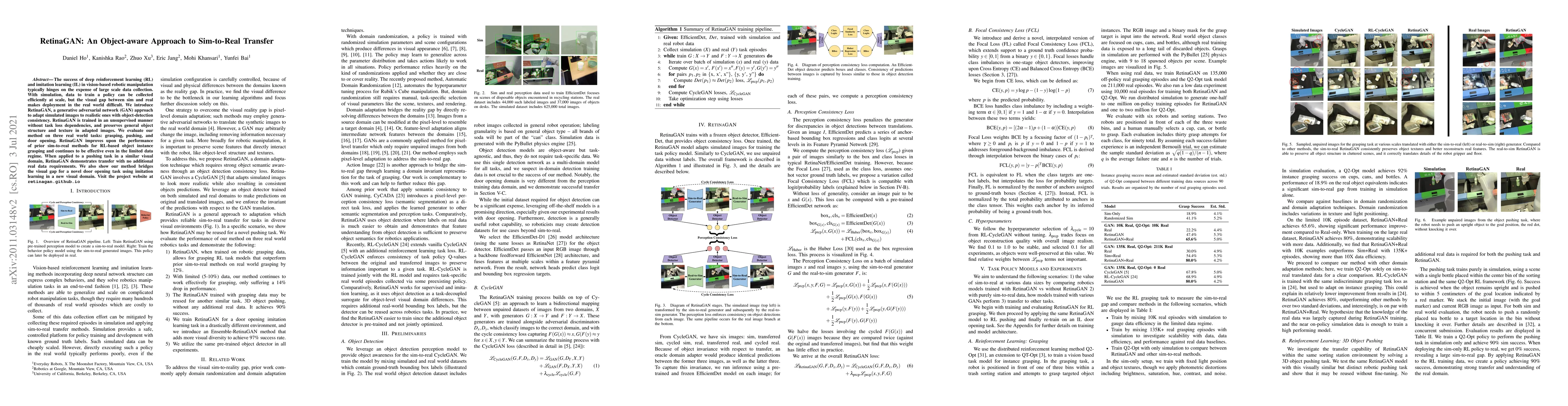 RetinaGAN employs a GAN-based approach to bridge the sim-to-real transfer gap in vision-based robotic tasks, achieving object-detection consistency and preserving object structure and texture. The method improves performance in grasping, pushing, and door opening tasks without requiring additional real data.