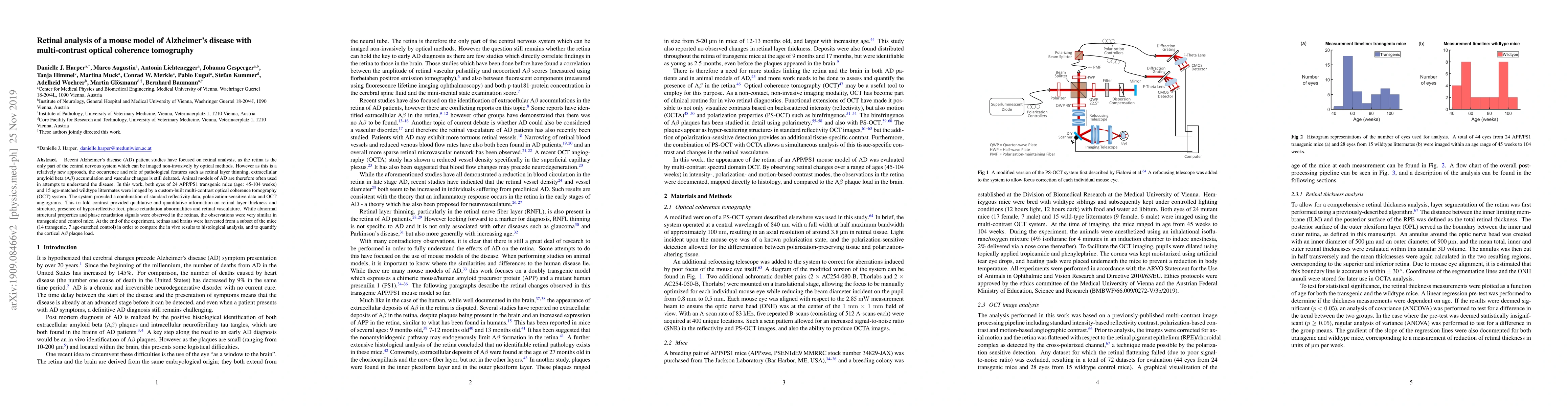 This study utilized multi-contrast optical coherence tomography (OCT) to analyze retinal changes in APP/PS1 transgenic mice, a model of Alzheimer's disease, compared to wildtype controls. Despite observing similar retinal abnormalities in both groups, the study highlights the potential of OCT for non-invasive retinal analysis in Alzheimer's research.