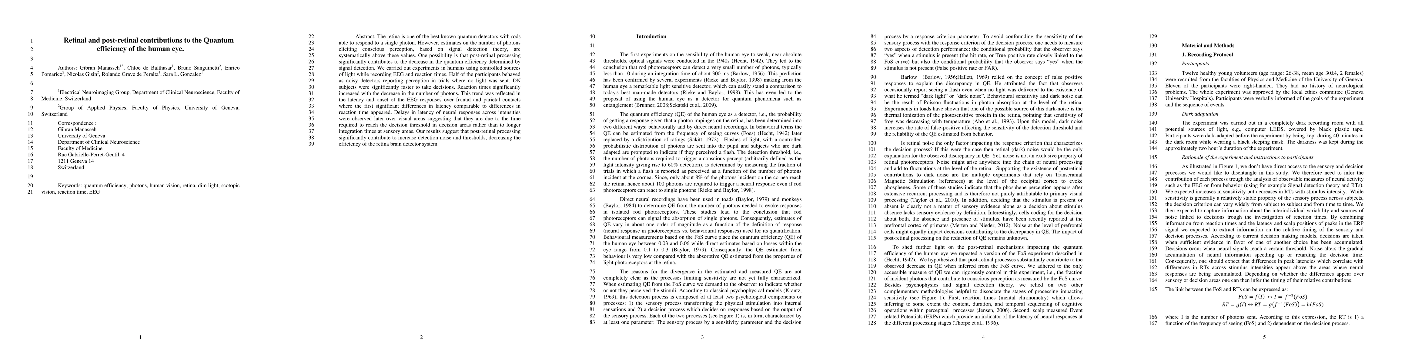The retina is one of the best known quantum detectors with rods able to respond to a single photon. However, estimates on the number of photons eliciting conscious perception, based on signal detection theory, are systematically above these values. One possibility is that post-retinal processing significantly contributes to the decrease in the quantum efficiency determined by signal detection. We carried out experiments in humans using controlled sources of light while recording EEG and reaction times. Half of the participants behaved as noisy detectors reporting perception in trials where no light was sent. DN subjects were significantly faster to take decisions. Reaction times significantly increased with the decrease in the number of photons. This trend was reflected in the latency and onset of the EEG responses over frontal and parietal contacts where the first significant differences in latency comparable to differences in reaction time appeared. Delays in latency of neural responses across intensities were observed later over visual areas suggesting that they are due to the time required to reach the decision threshold in decision areas rather than to longer integration times at sensory areas. Our results suggest that post-retinal processing significantly contribute to increase detection noise and thresholds, decreasing the efficiency of the retina brain detector system.