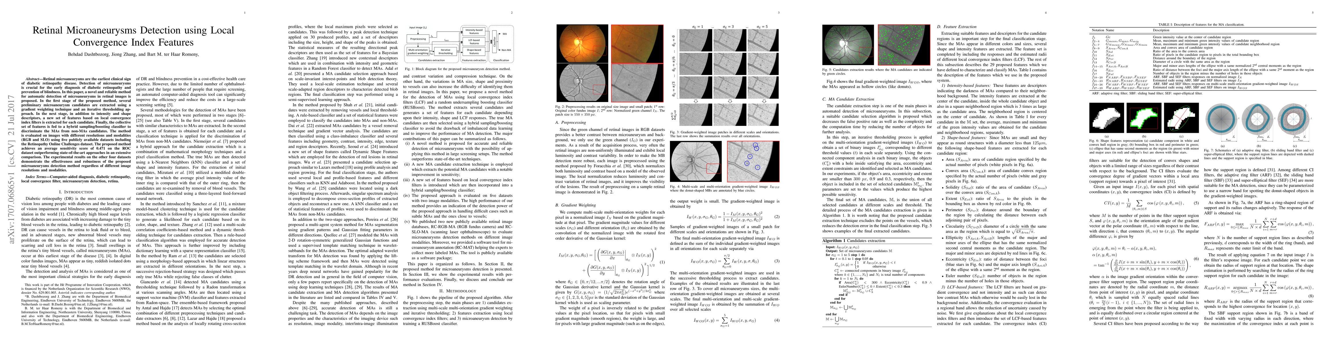 This paper proposes a novel method for automatic detection of retinal microaneurysms using local convergence index features, achieving higher sensitivity compared to state-of-the-art approaches across various datasets and image modalities. The method combines gradient weighting and iterative thresholding for initial candidate extraction, followed by a robust classifier based on hybrid sampling and boosting.