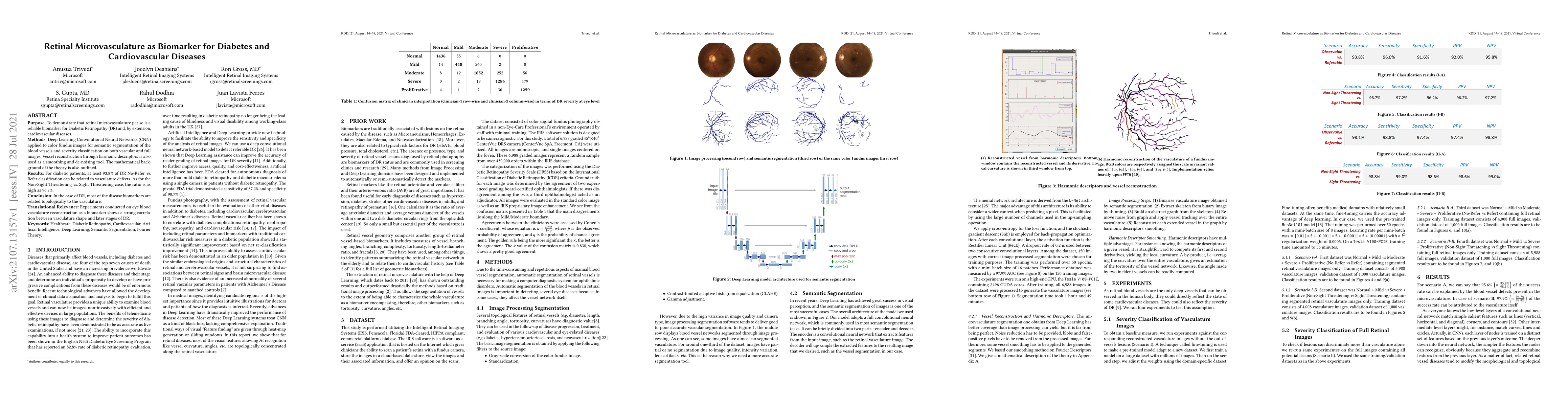Purpose: To demonstrate that retinal microvasculature per se is a reliable biomarker for Diabetic Retinopathy (DR) and, by extension, cardiovascular diseases. Methods: Deep Learning Convolutional Neural Networks (CNN) applied to color fundus images for semantic segmentation of the blood vessels and severity classification on both vascular and full images. Vessel reconstruction through harmonic descriptors is also used as a smoothing and de-noising tool. The mathematical background of the theory is also outlined. Results: For diabetic patients, at least 93.8% of DR No-Refer vs. Refer classification can be related to vasculature defects. As for the Non-Sight Threatening vs. Sight Threatening case, the ratio is as high as 96.7%. Conclusion: In the case of DR, most of the disease biomarkers are related topologically to the vasculature. Translational Relevance: Experiments conducted on eye blood vasculature reconstruction as a biomarker shows a strong correlation between vasculature shape and later stages of DR.