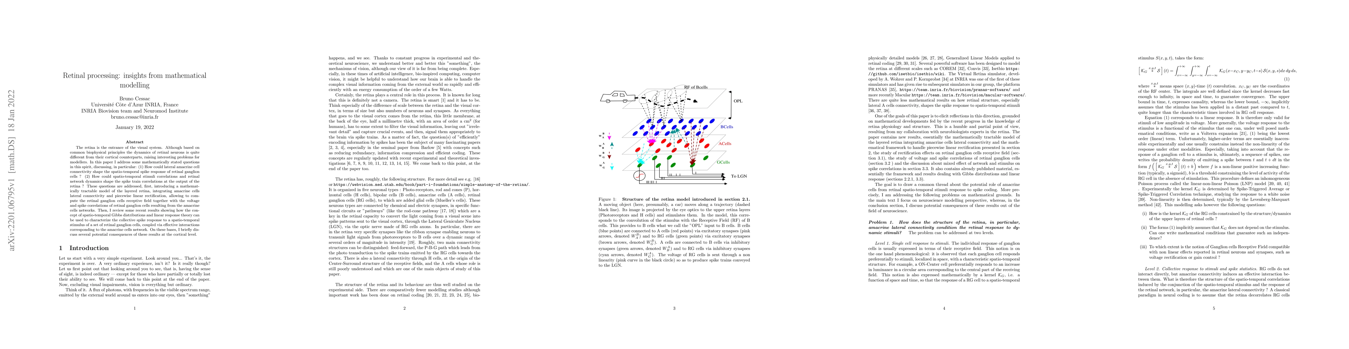 The retina is the entrance of the visual system. Although based on common biophysical principles the dynamics of retinal neurons is quite different from their cortical counterparts, raising interesting problems for modellers. In this paper I address some mathematically stated questions in this spirit, discussing, in particular: (1) How could lateral amacrine cell connectivity shape the spatio-temporal spike response of retinal ganglion cells ? (2) How could spatio-temporal stimuli correlations and retinal network dynamics shape the spike train correlations at the output of the retina ? These questions are addressed, first, introducing a mathematically tractable model of the layered retina, integrating amacrine cells lateral connectivity and piecewise linear rectification, allowing to compute the retinal ganglion cells receptive field together with the voltage and spike correlations of retinal ganglion cells resulting from the amacrine cells networks. Then, I review some recent results showing how the concept of spatio-temporal Gibbs distributions and linear response theory can be used to characterize the collective spike response to a spatio-temporal stimulus of a set of retinal ganglion cells, coupled via effective interactions corresponding to the amacrine cells network. On these bases, I briefly discuss several potential consequences of these results at the cortical level.