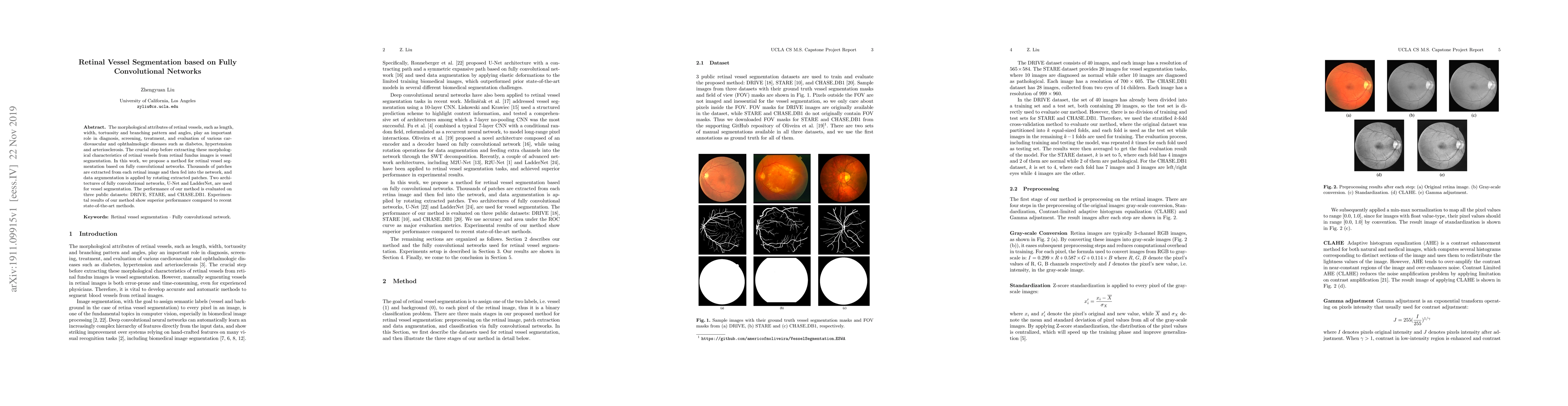 This paper proposes a method for retinal vessel segmentation using fully convolutional networks, specifically U-Net and LadderNet, to extract morphological attributes from retinal fundus images. The method shows superior performance compared to recent state-of-the-art methods on three public datasets.